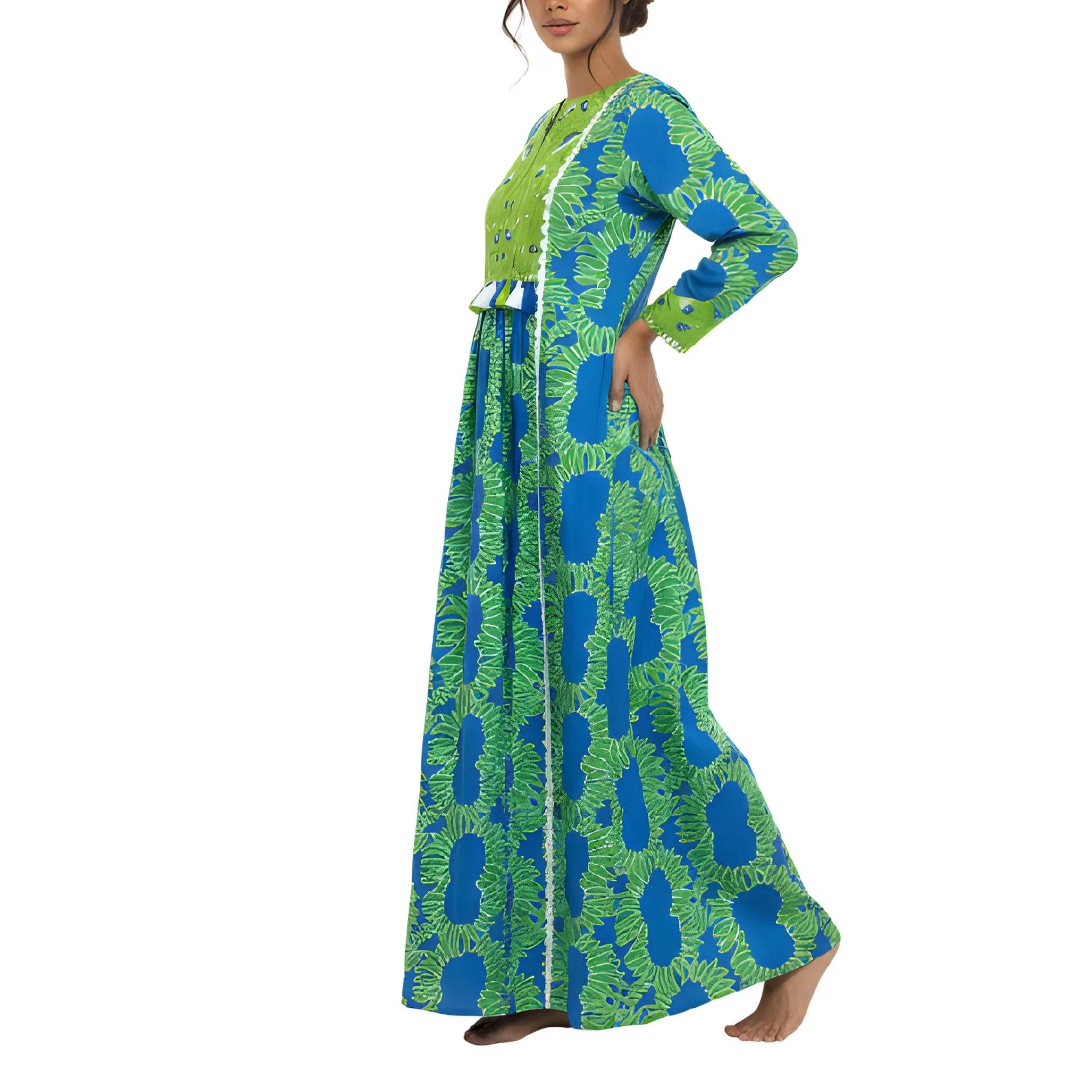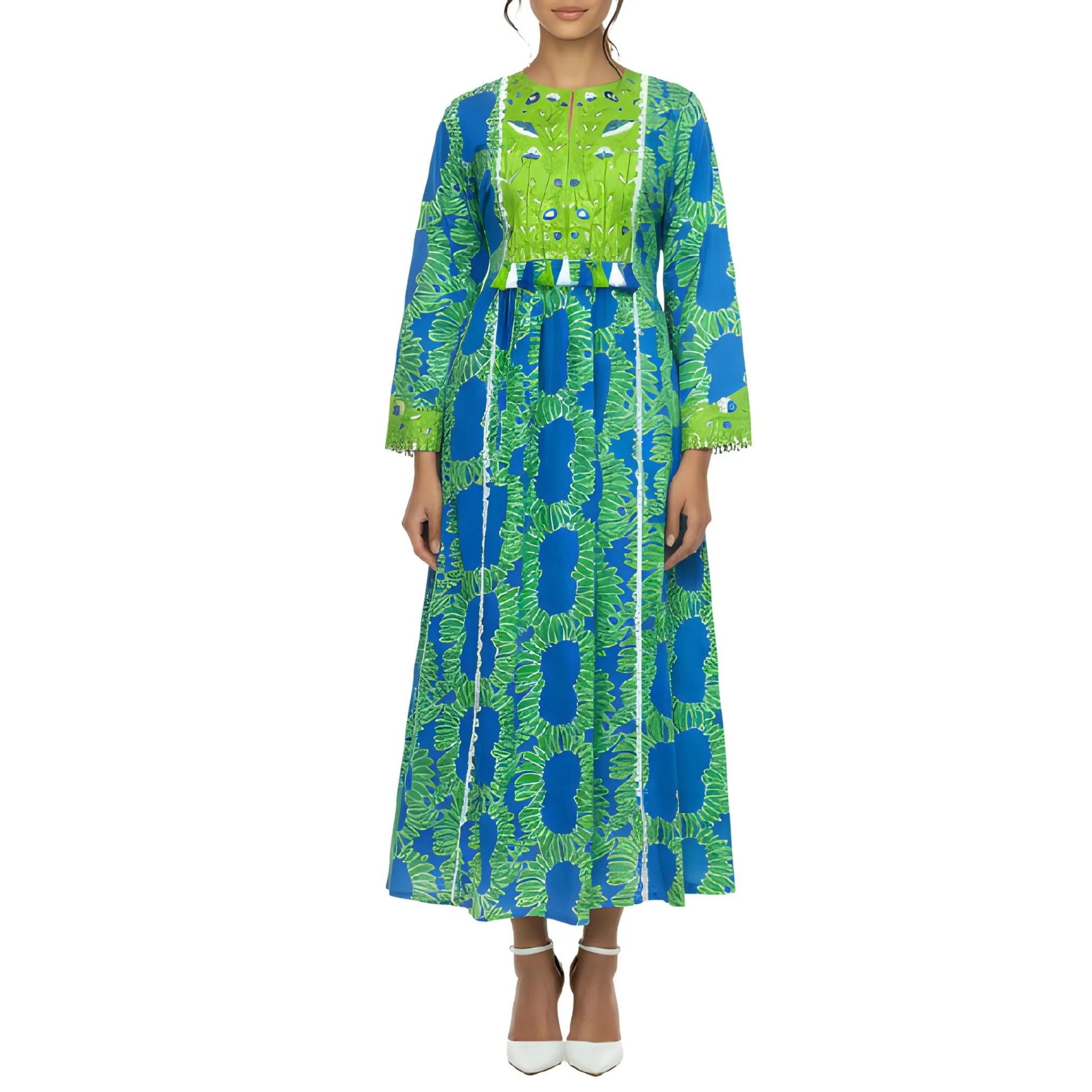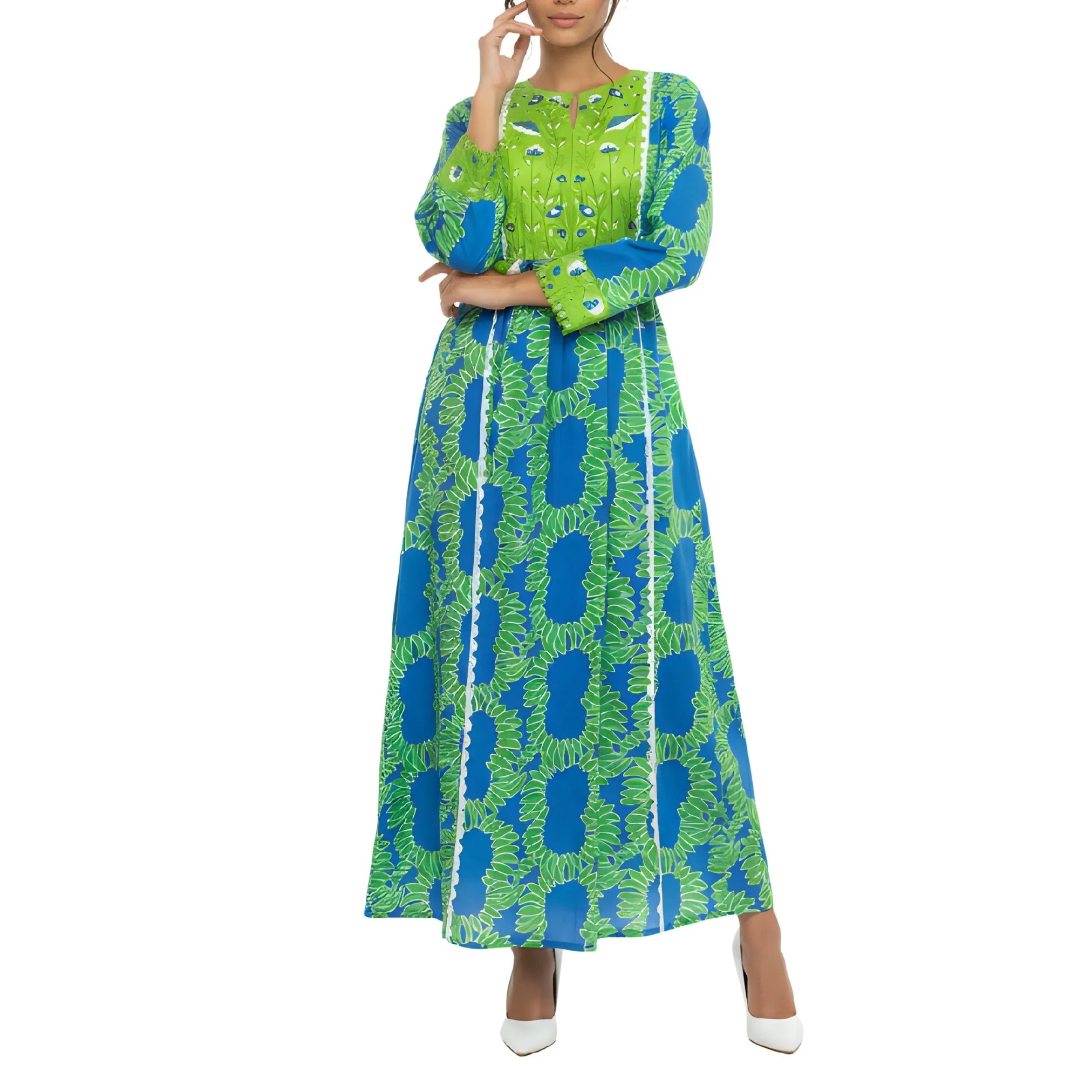 Crafted in a bold palette of cobalt blue and fresh green, the design features an all-over botanical motif that creates strong visual rhythm across the length. A contrasting green yoke panel at the front is detailed with decorative tassel elements and fine cut accents, drawing focus to the upper silhouette. Vertical trim lines run down the body, subtly elongating the form while adding structure to the flowing print. Long sleeves continue the floral pattern and finish with clean edges for a balanced look. Made from cotton, the fabric appears smooth, lightweight, and breathable, well suited to warm climates and extended wear.