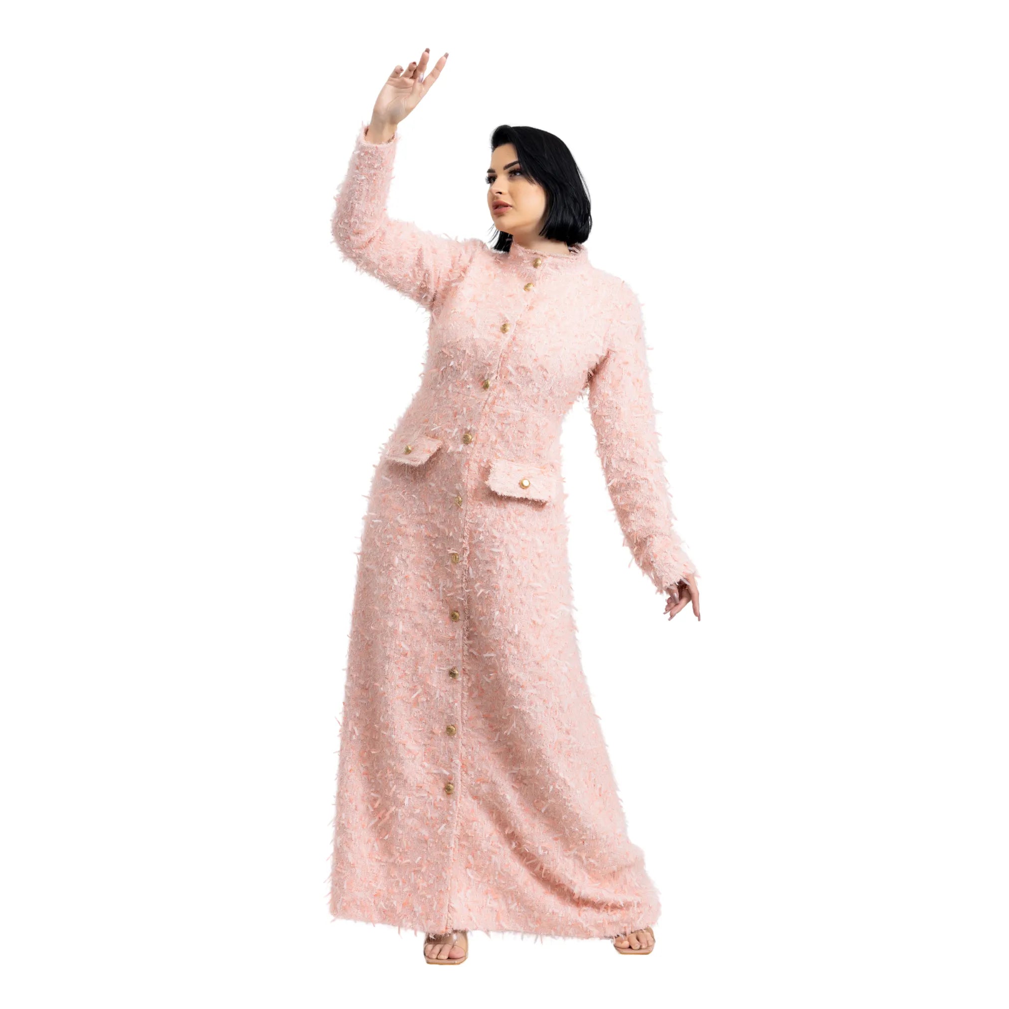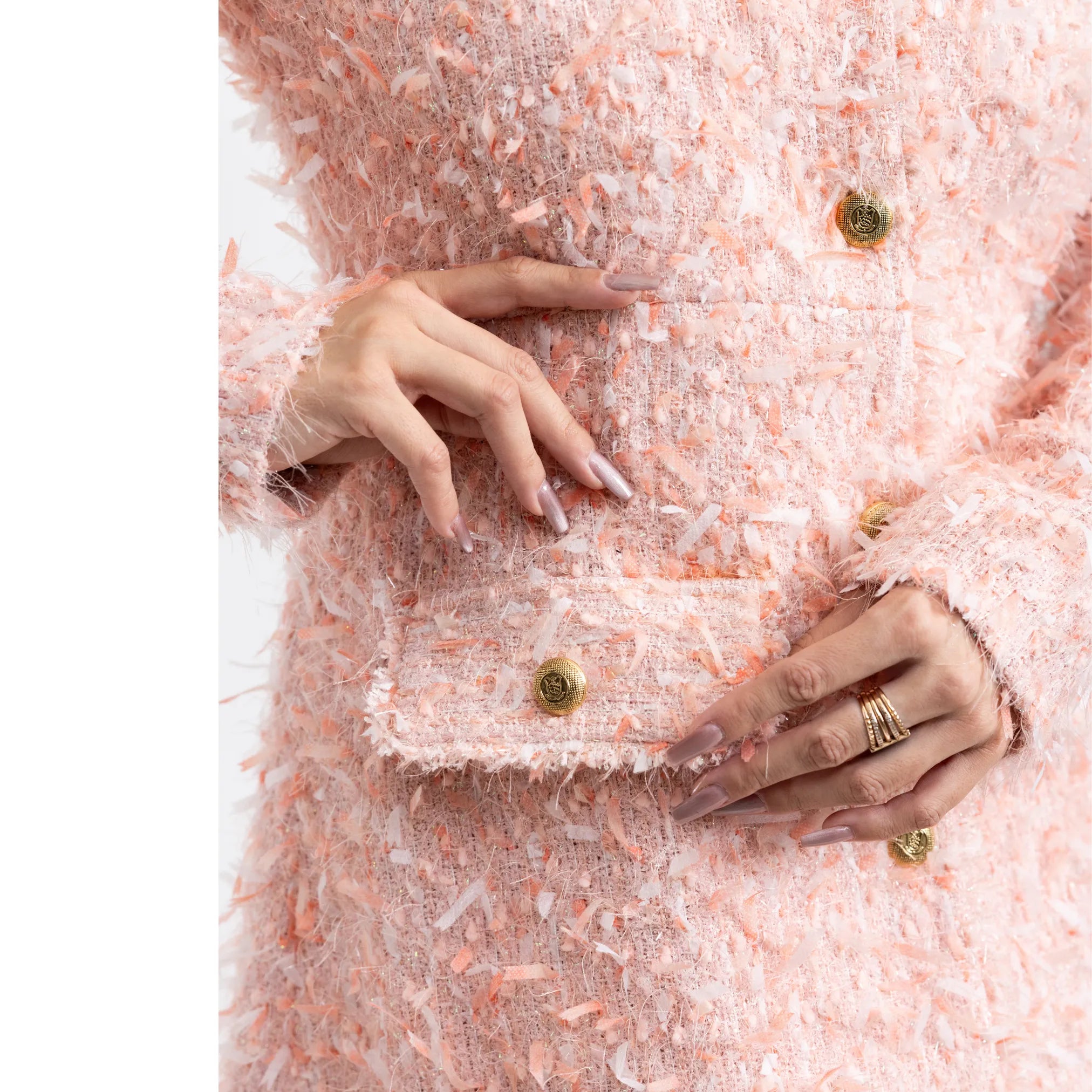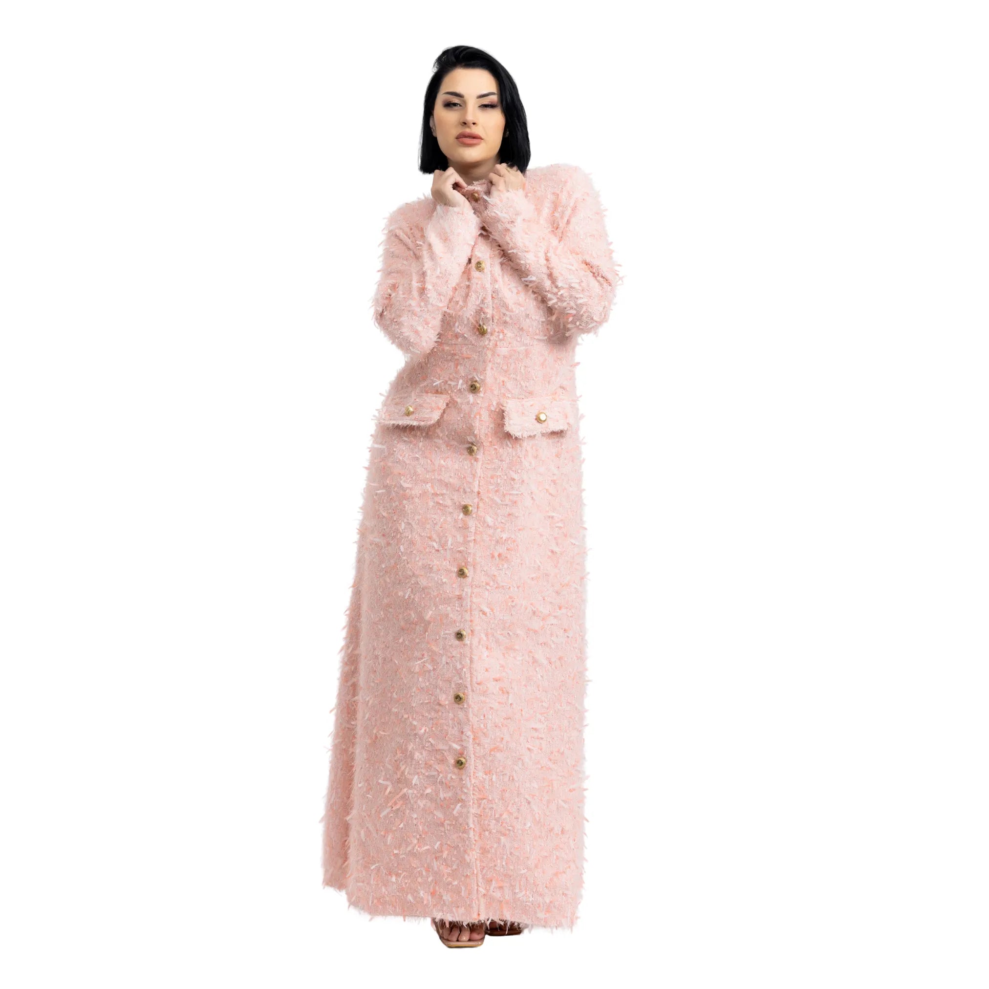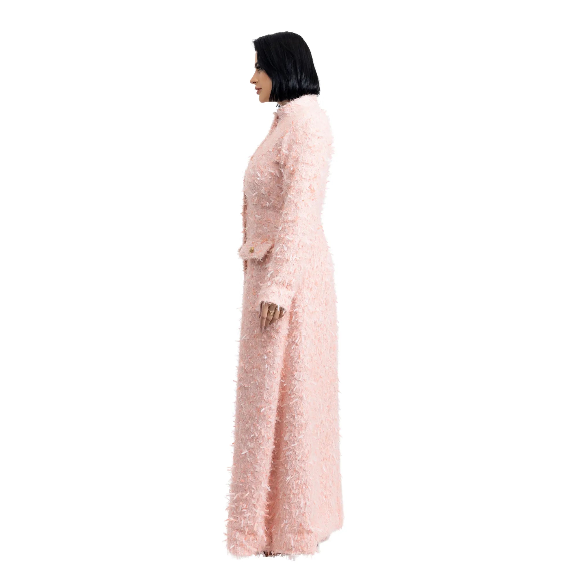 A full-length luxury tweed dress designed with a structured silhouette and fine couture detailing. This piece features textured wool-tweed fabric with soft feathered accents throughout, creating a rich dimensional surface perfect for winter and special occasions.