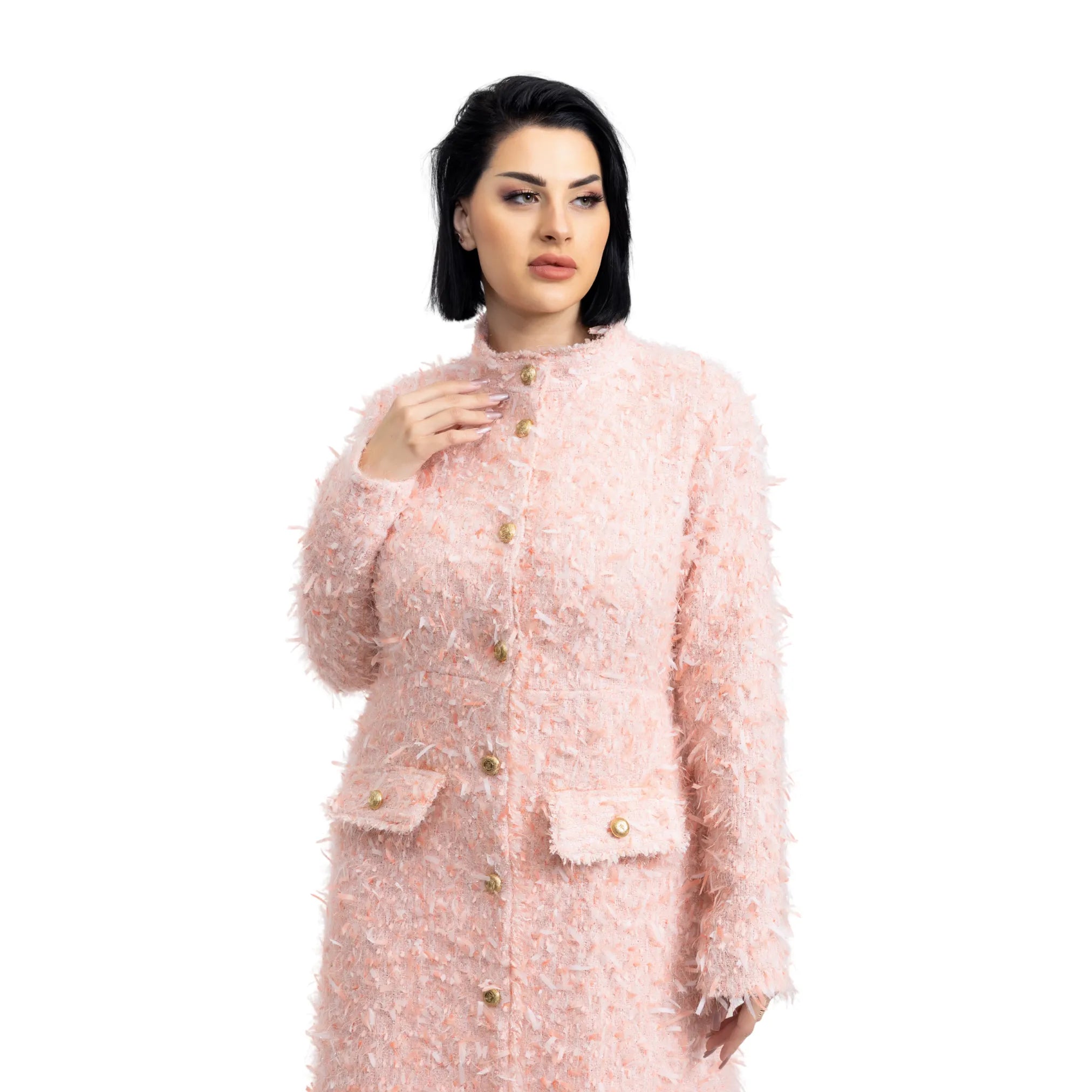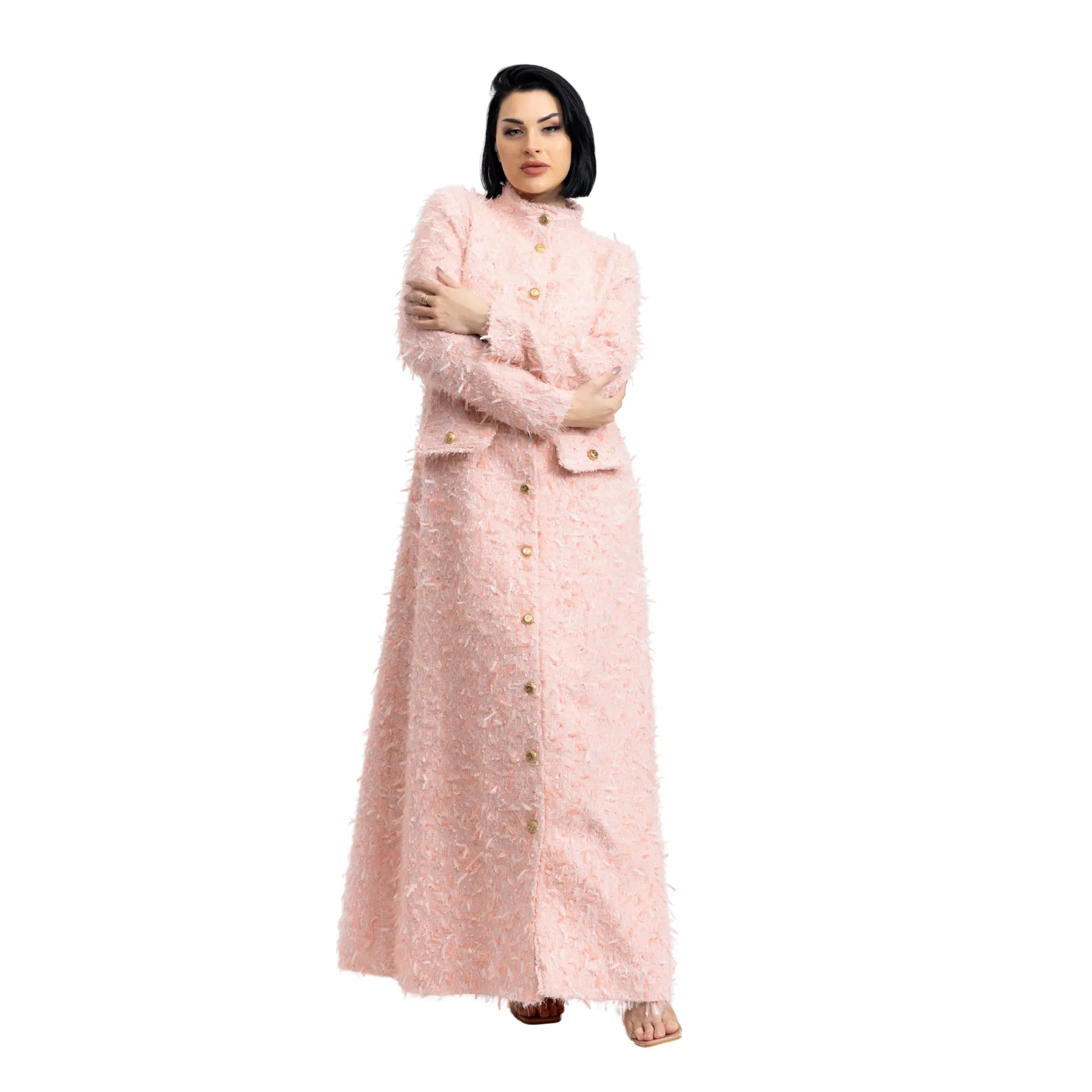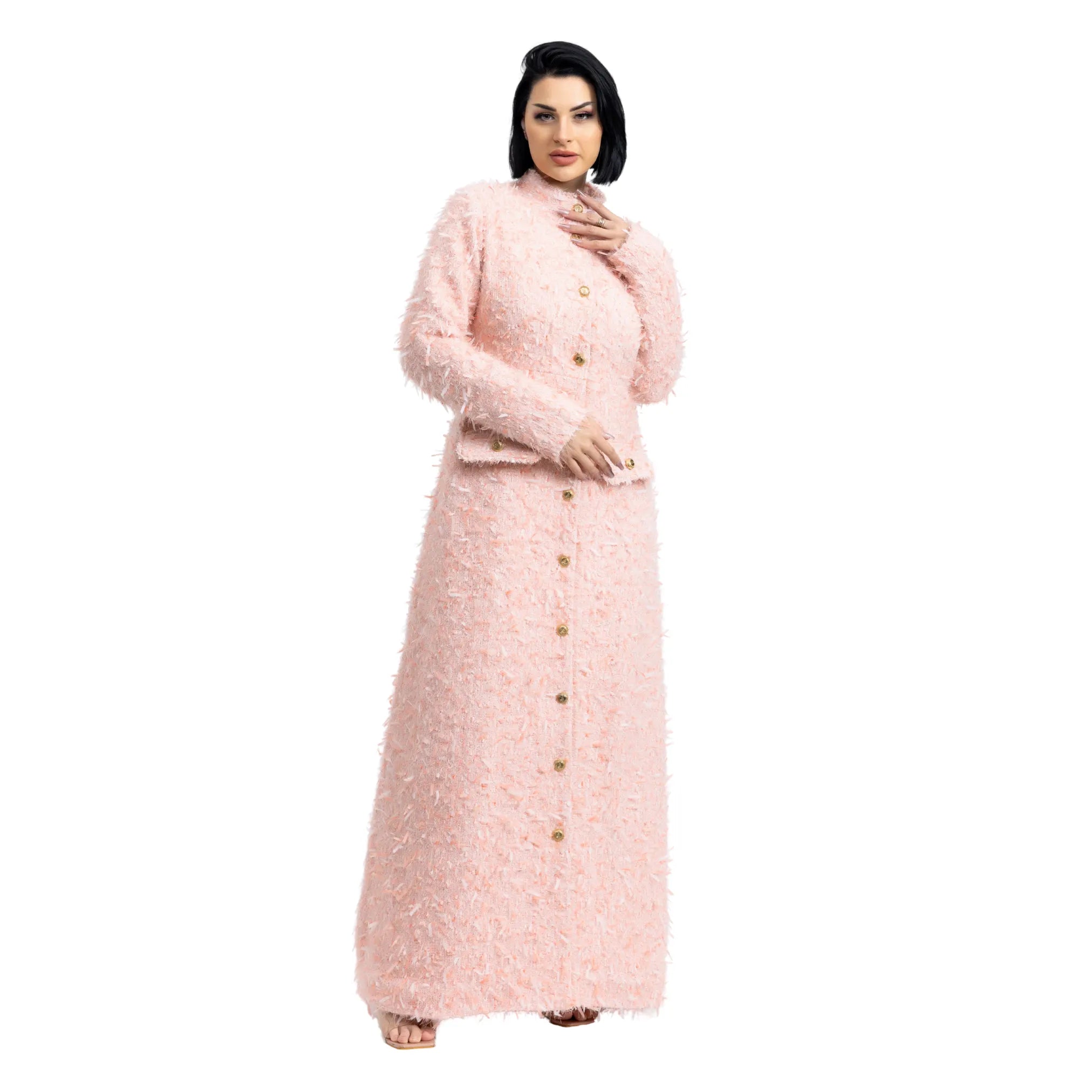 A full-length luxury tweed dress designed with a structured silhouette and fine couture detailing. This piece features textured wool-tweed fabric with soft feathered accents throughout, creating a rich dimensional surface perfect for winter and special occasions.