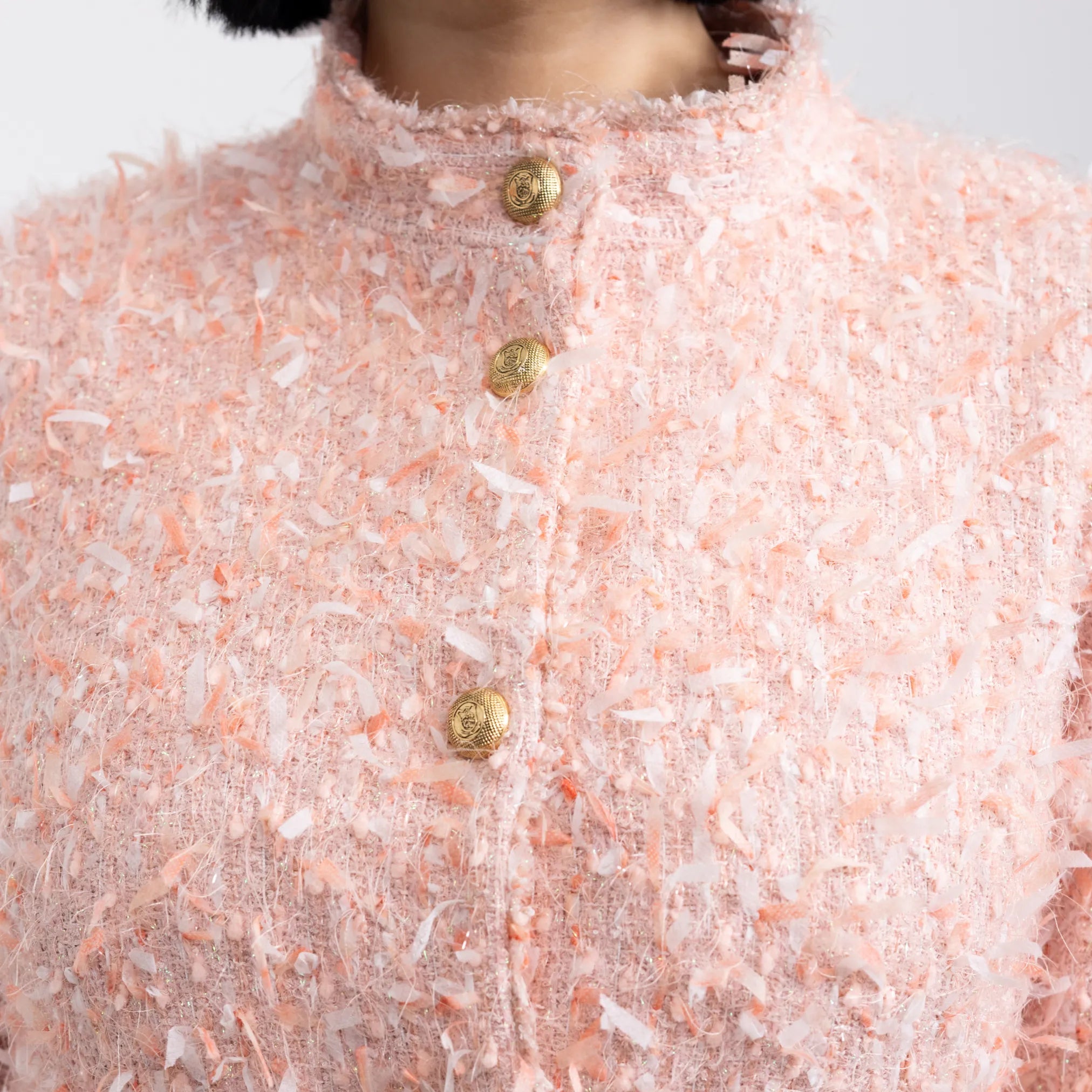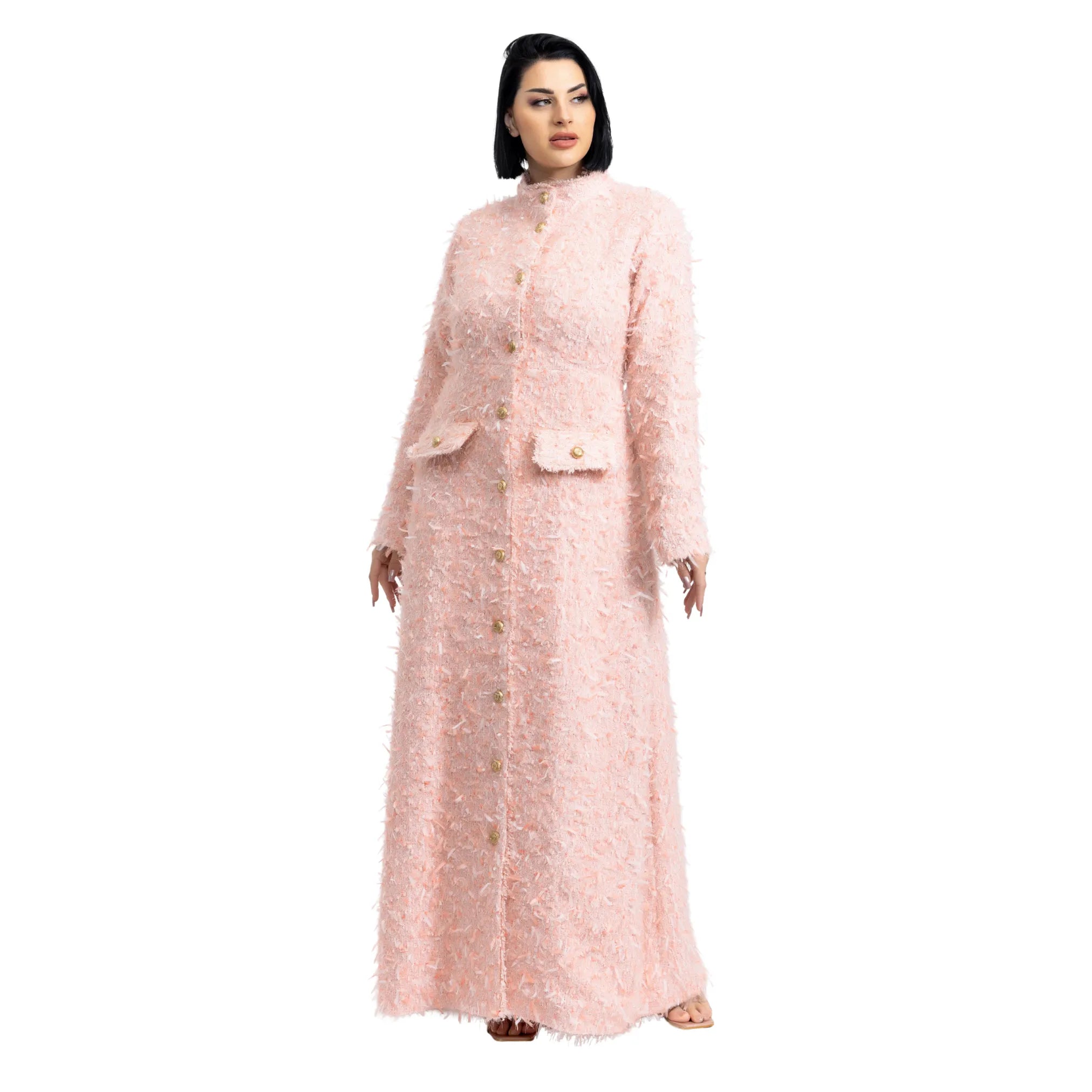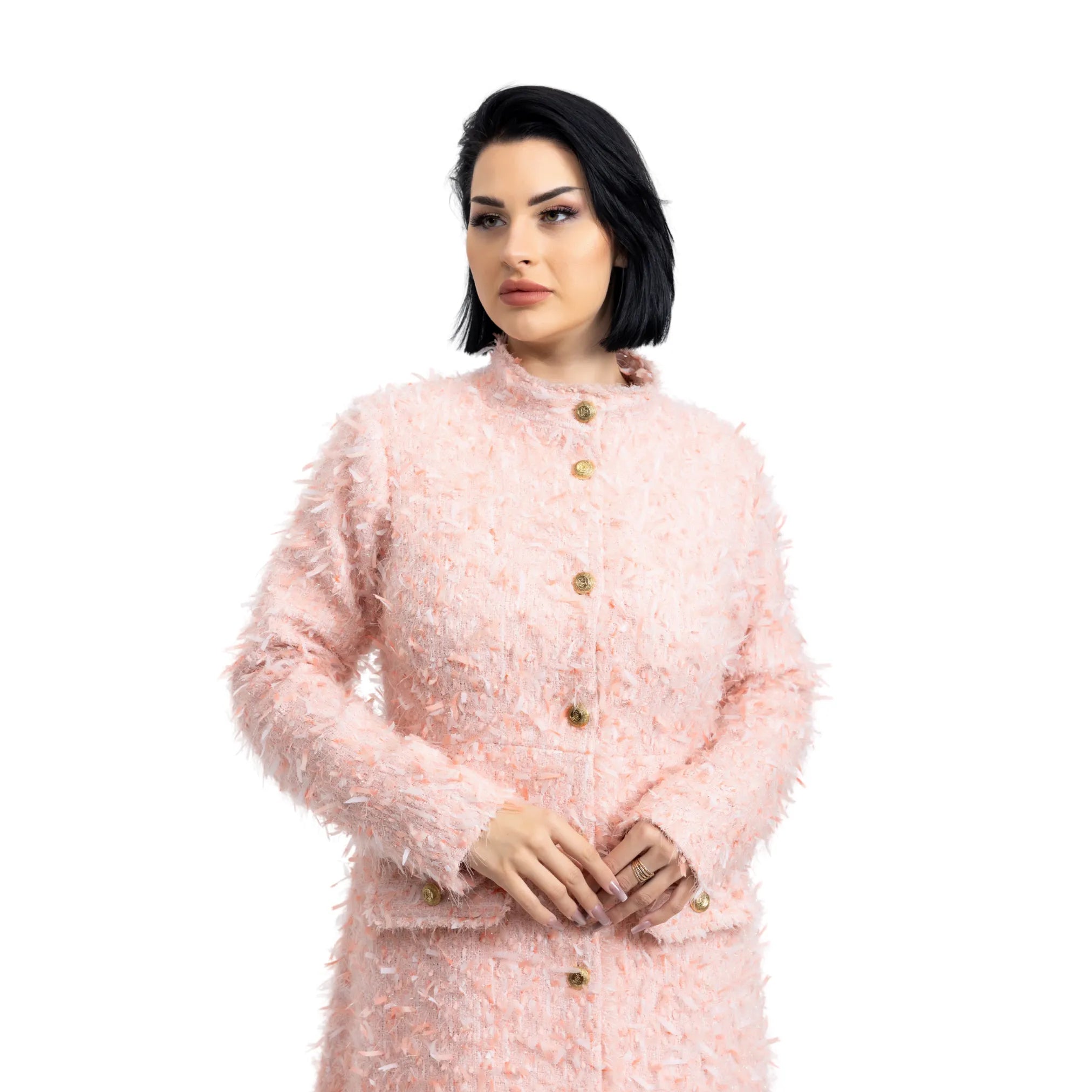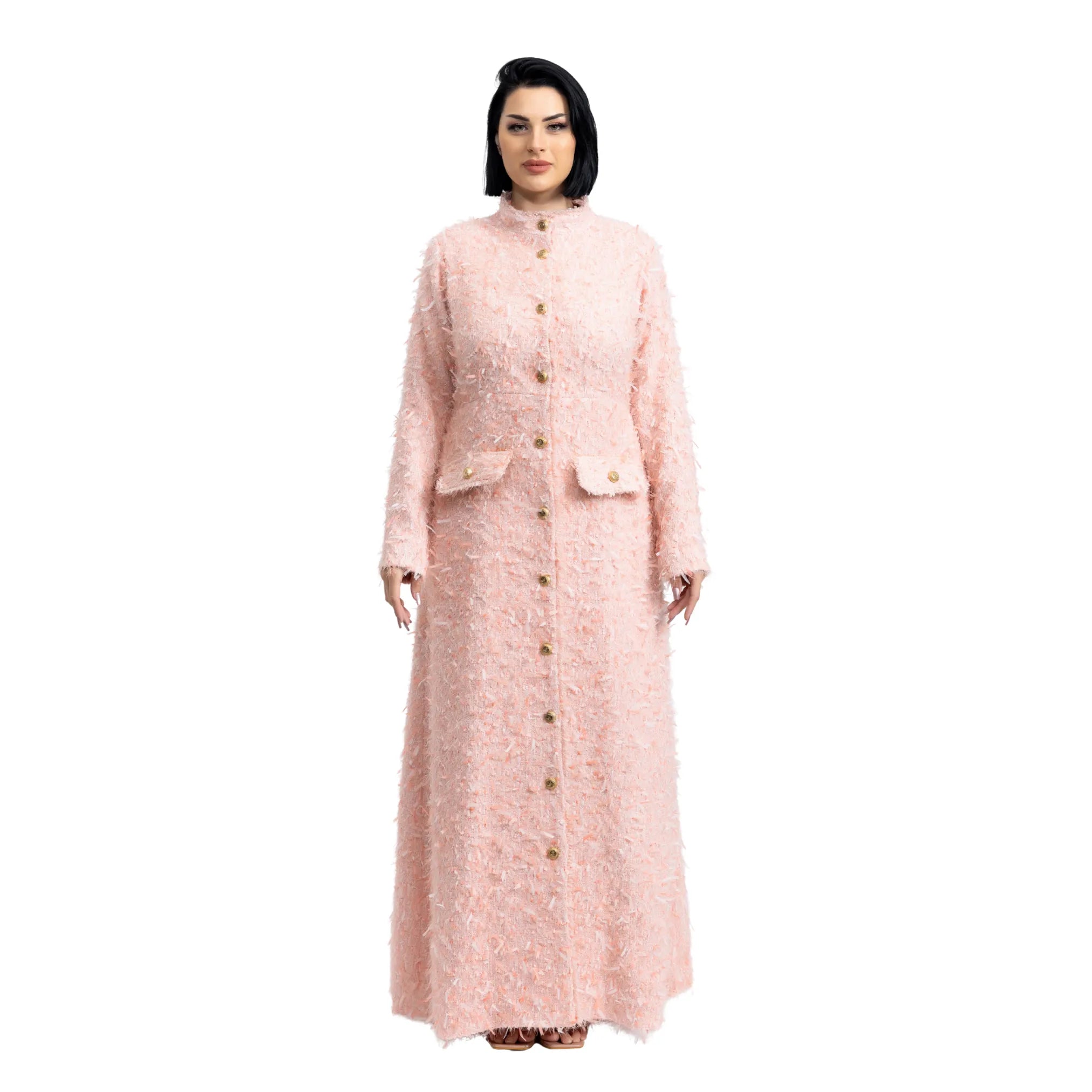 A full-length luxury tweed dress designed with a structured silhouette and fine couture detailing. This piece features textured wool-tweed fabric with soft feathered accents throughout, creating a rich dimensional surface perfect for winter and special occasions.
