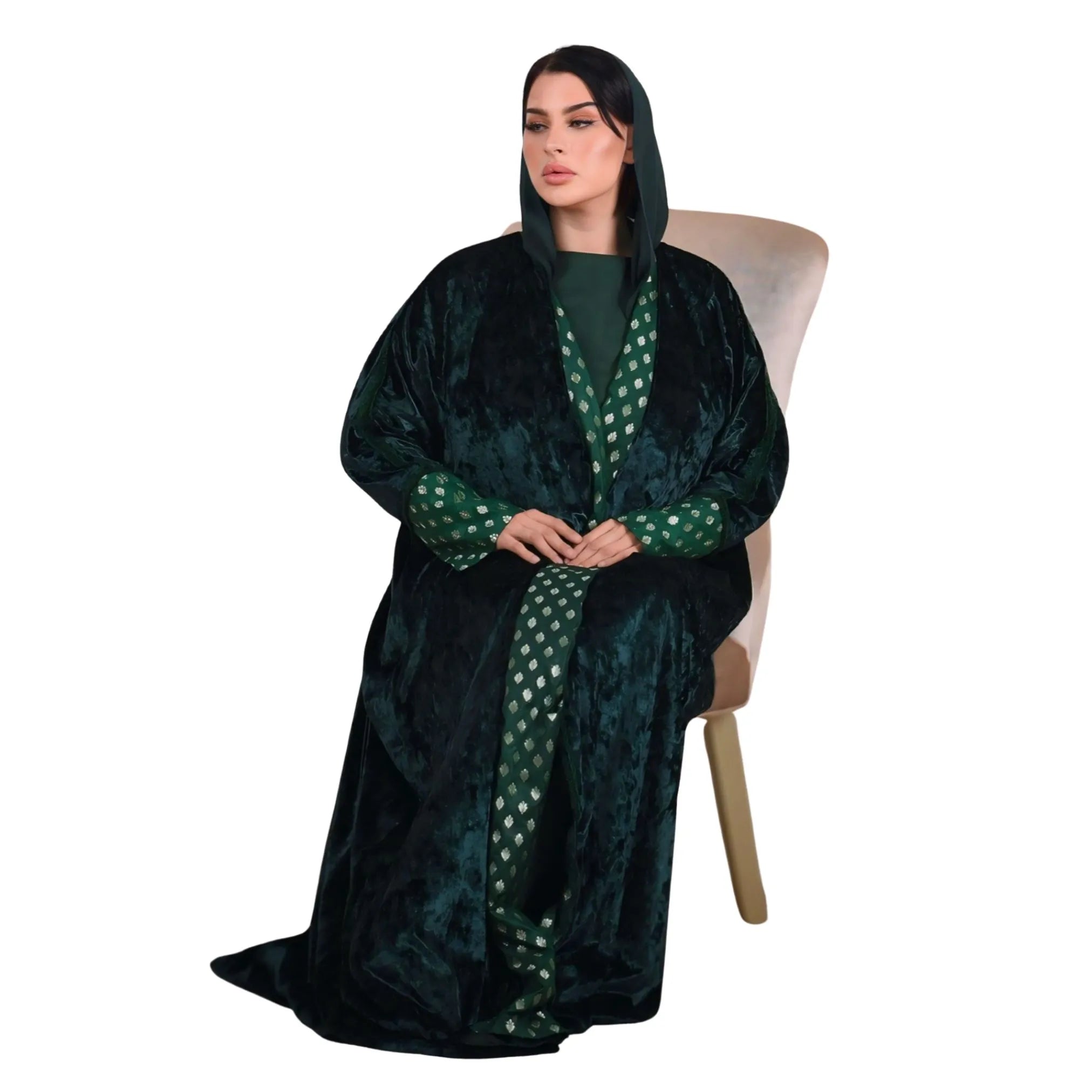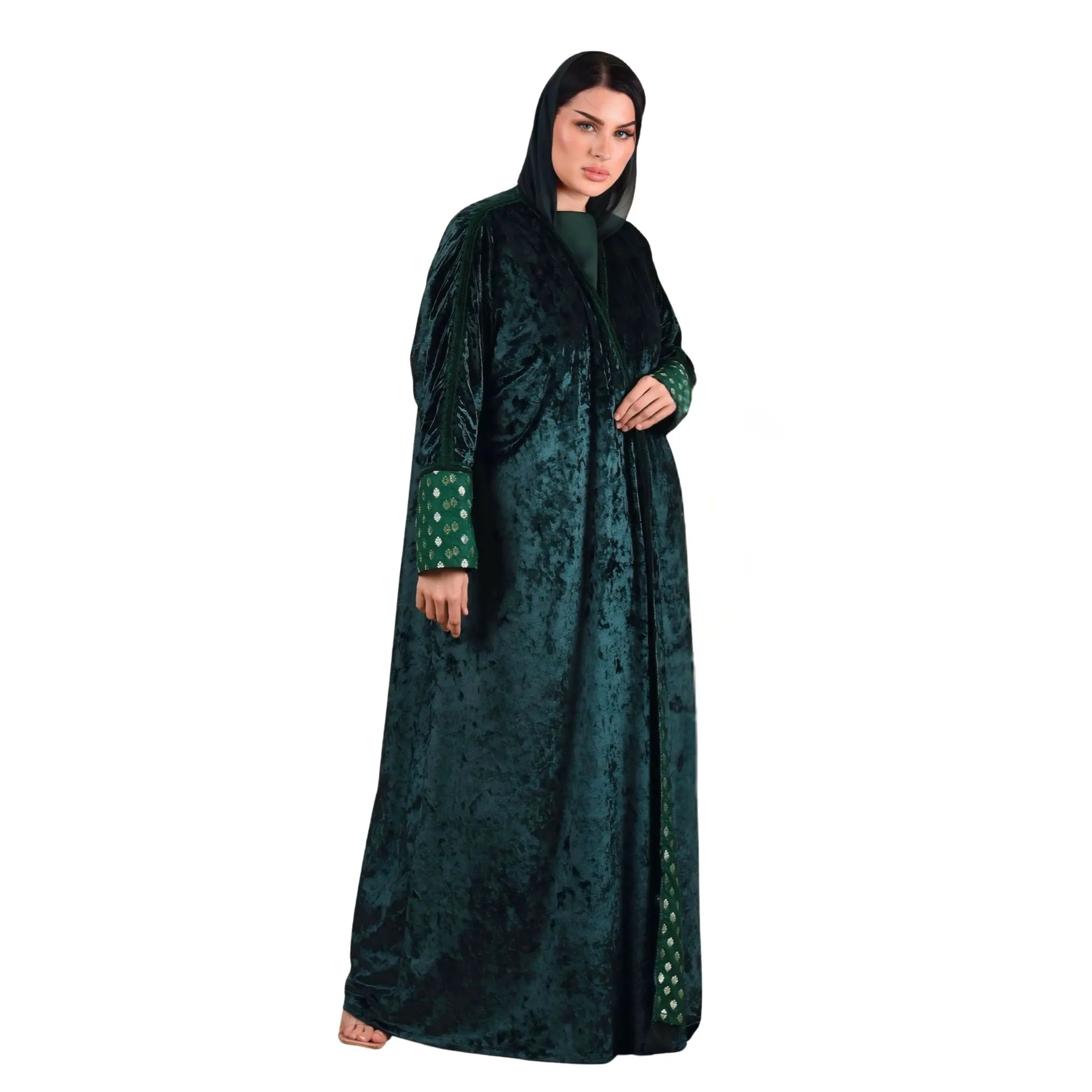 A refined winter abaya designed with a rich velvet finish and coordinated inner dress for elevated everyday wear. This winter velvet abaya is crafted to deliver a statement of understated luxury through its deep tone, soft texture, and fluid silhouette, making it a refined addition to a cold-season modest wardrobe.
