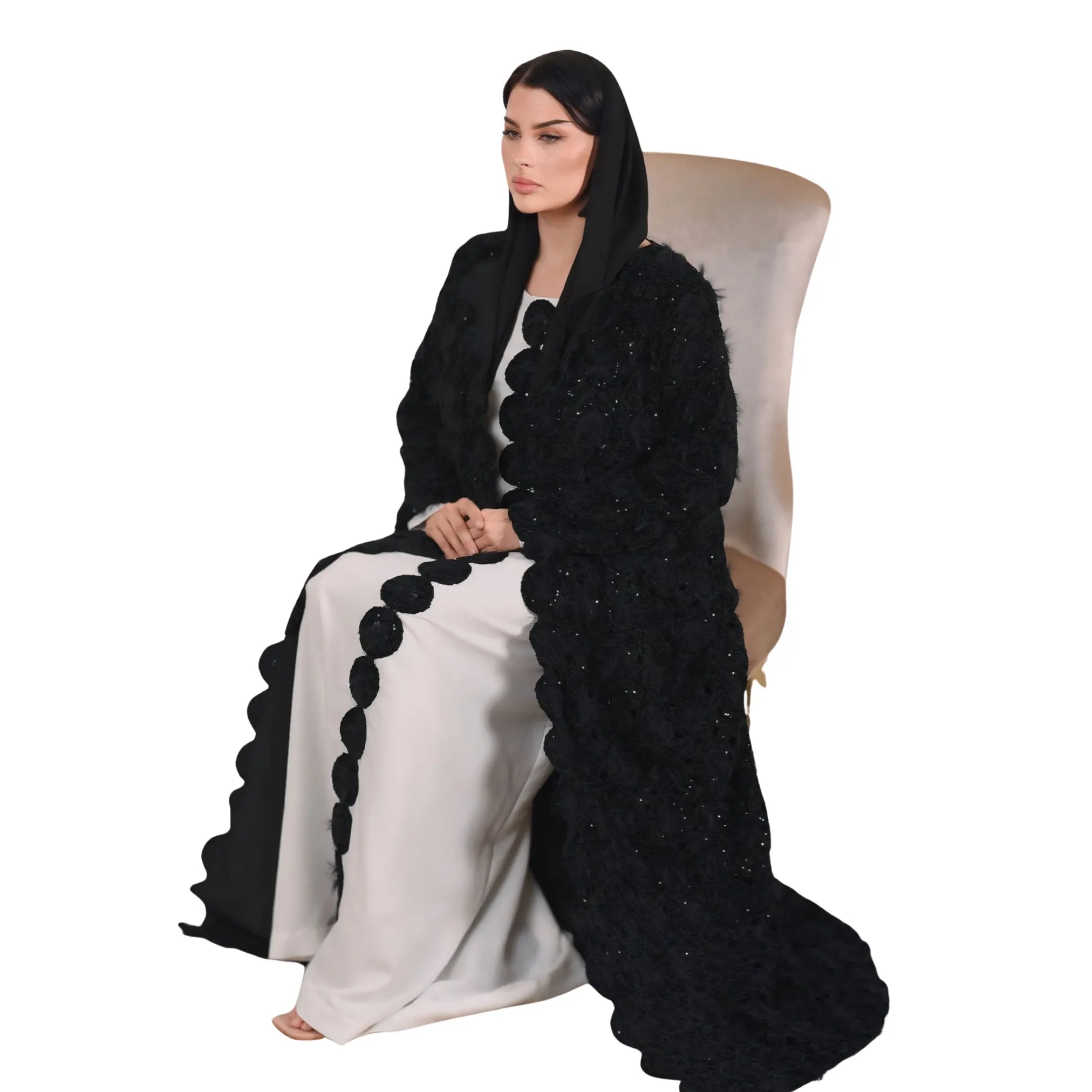صُممت هذه العباية المخملية باللون الأسود الداكن، وتتميز بسطح من الفرو الصناعي ذي الملمس المميز الذي يضفي عمقًا بصريًا ولمعانًا ناعمًا تحت الضوء. يتميز تصميمها المفتوح من الأمام بقصة مستقيمة طويلة، مما يوفر طبقة خارجية أنيقة ومنظمة تتحرك بانسيابية مع الجسم. كما تتخلل السطح لمسات من البريق الرقيق، مما يعزز من جمالها.