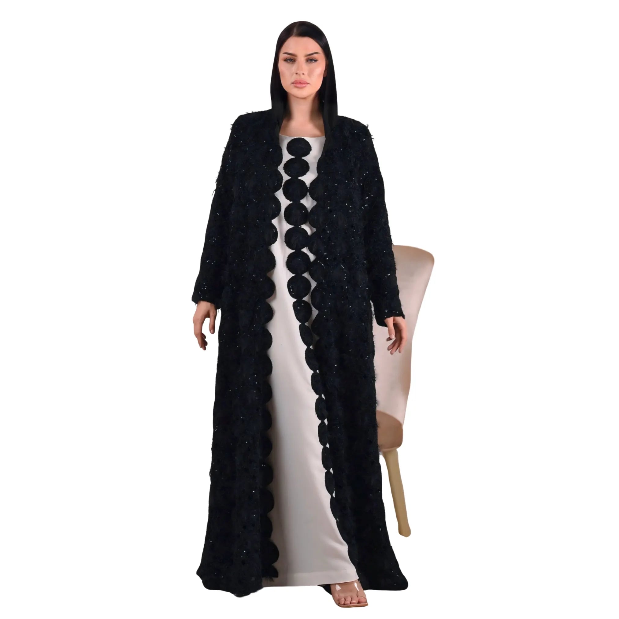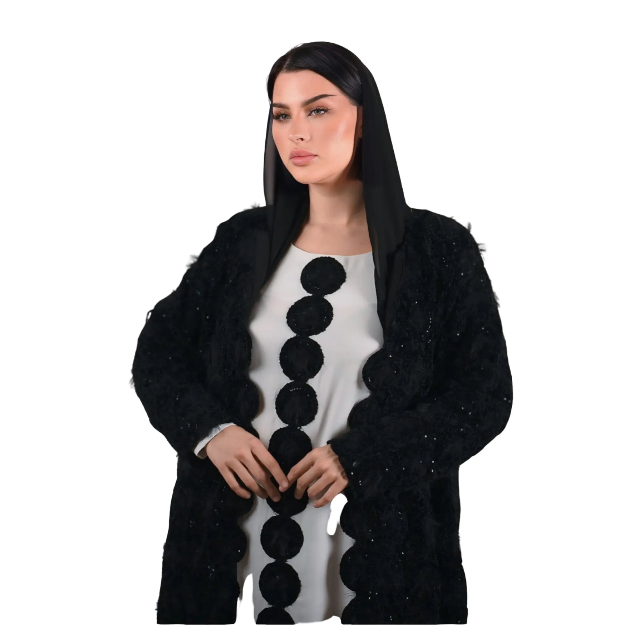 عباية سوداء طويلة من المخمل بنسيج الفرو الصناعي وفستان داخلي بلون مغاير مزين بتفاصيل دائرية مطرزة.