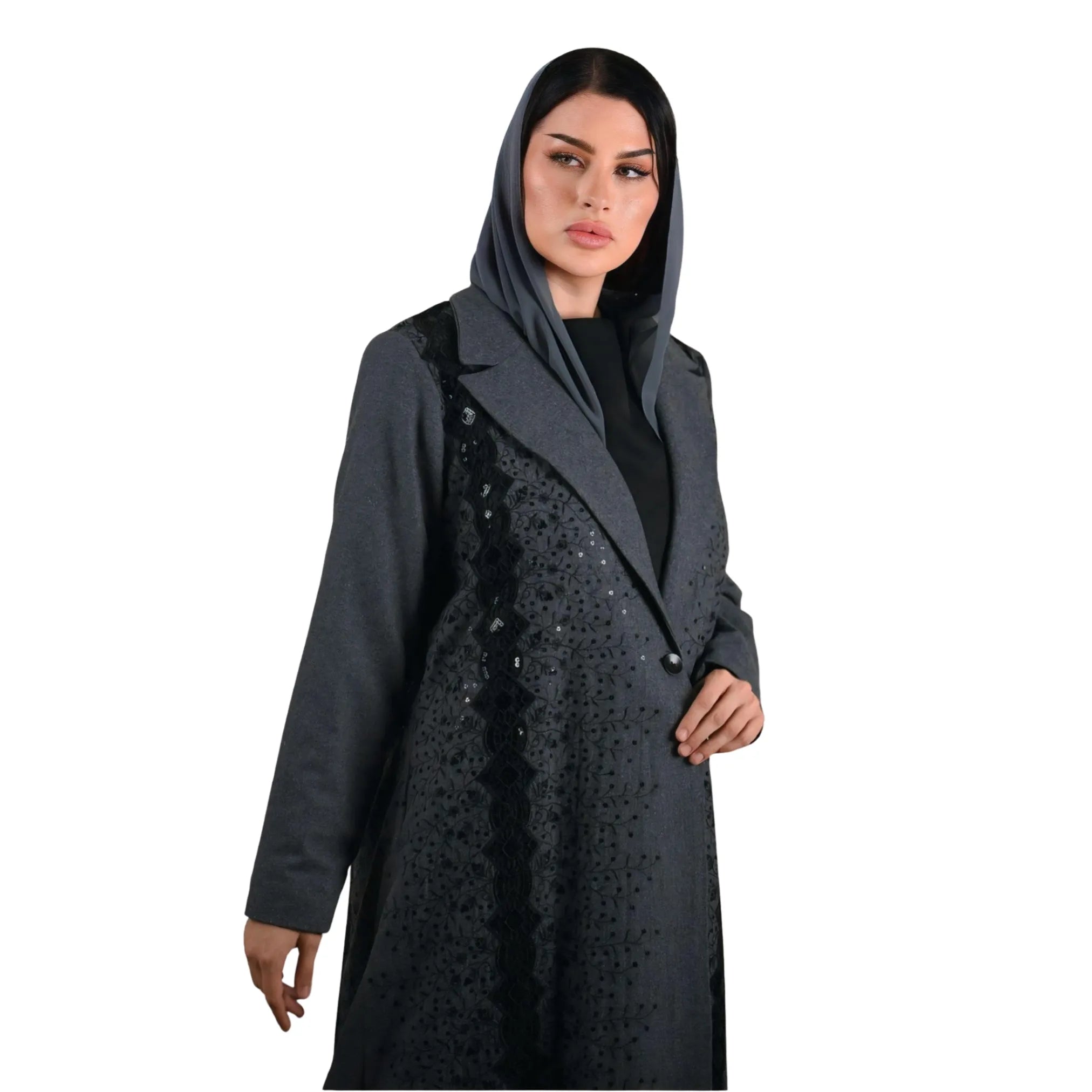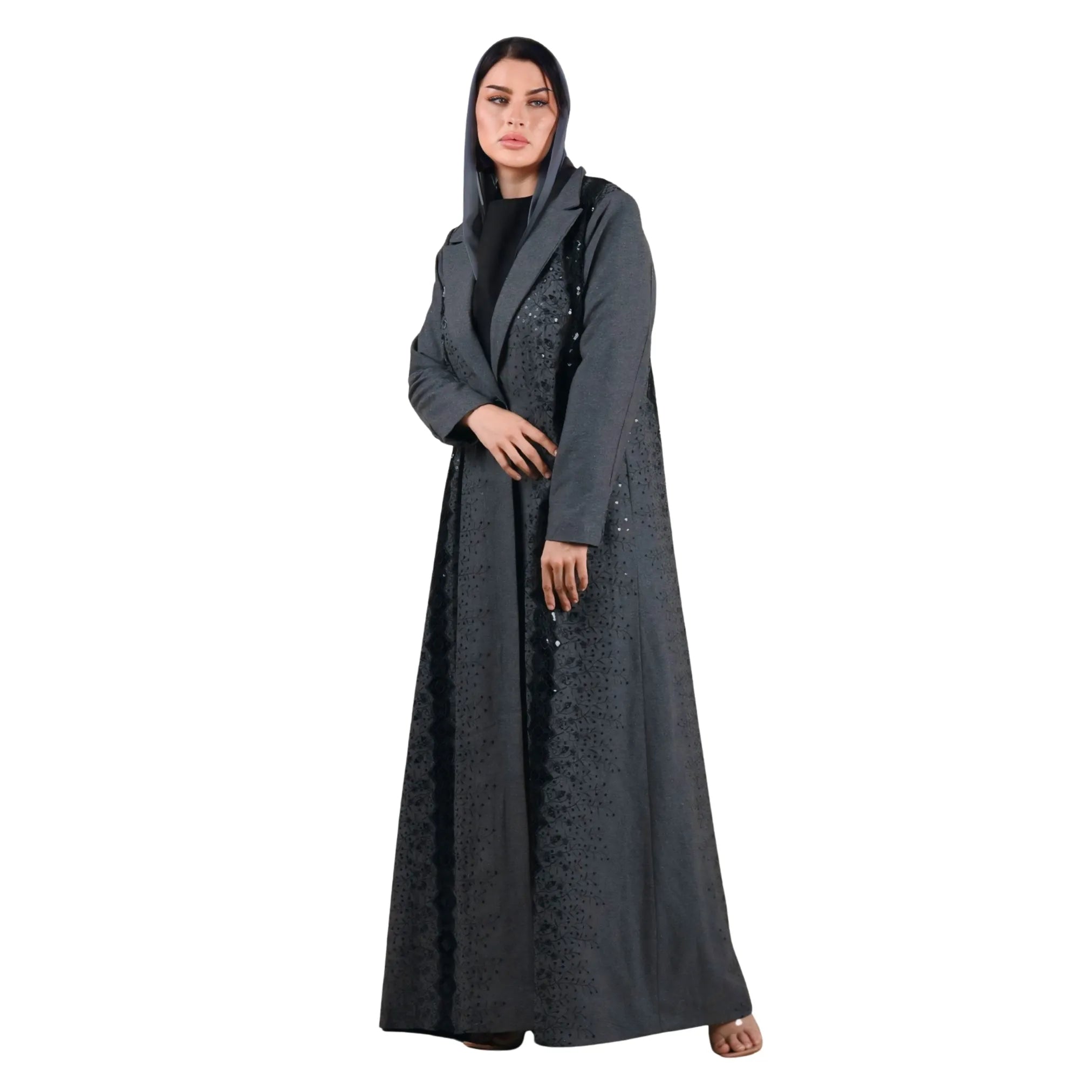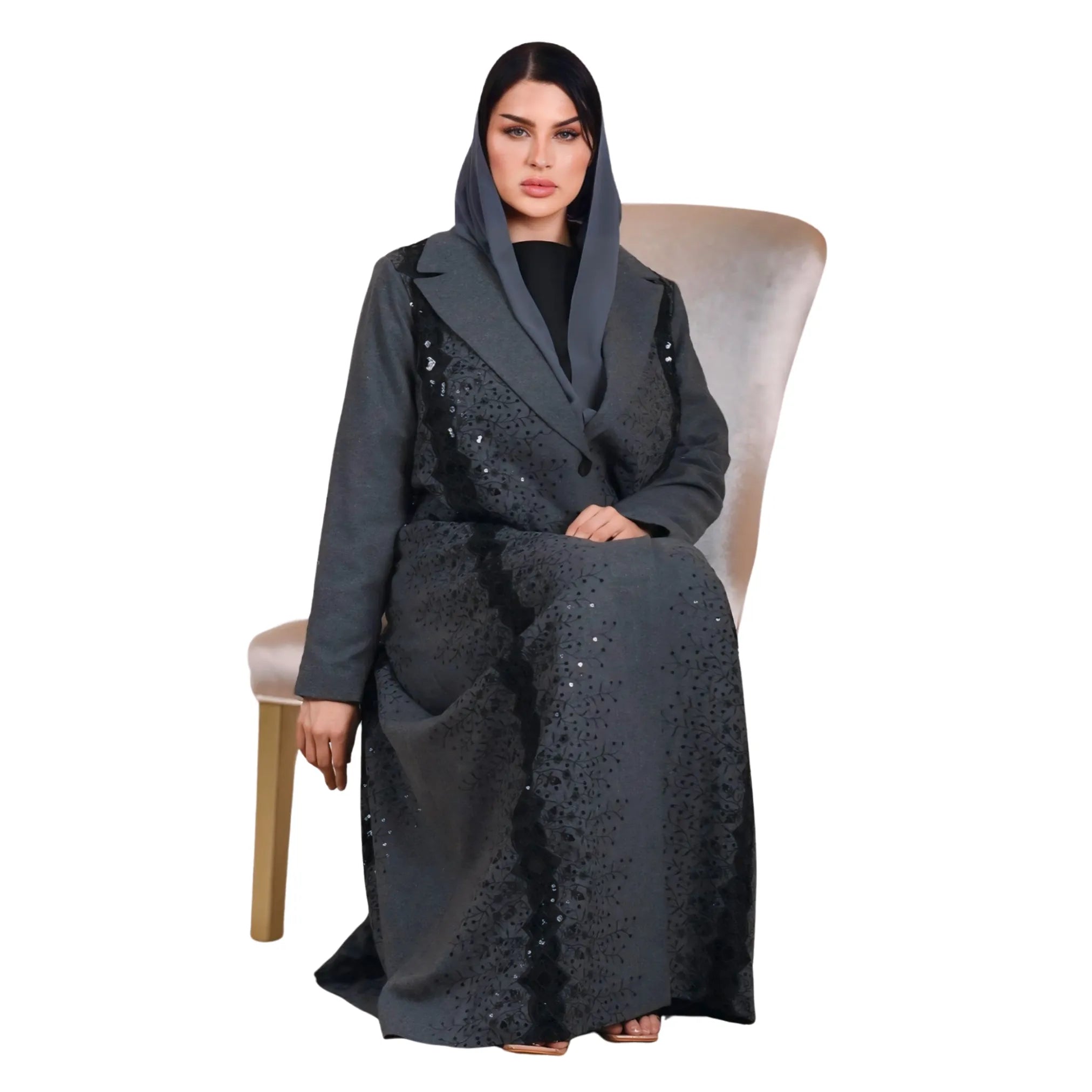 عباية بليزر من الصوف الفحمي بتصميم أنيق وتفاصيل ترتر دقيقة، مع فستان داخلي لإطلالة شتوية راقية.