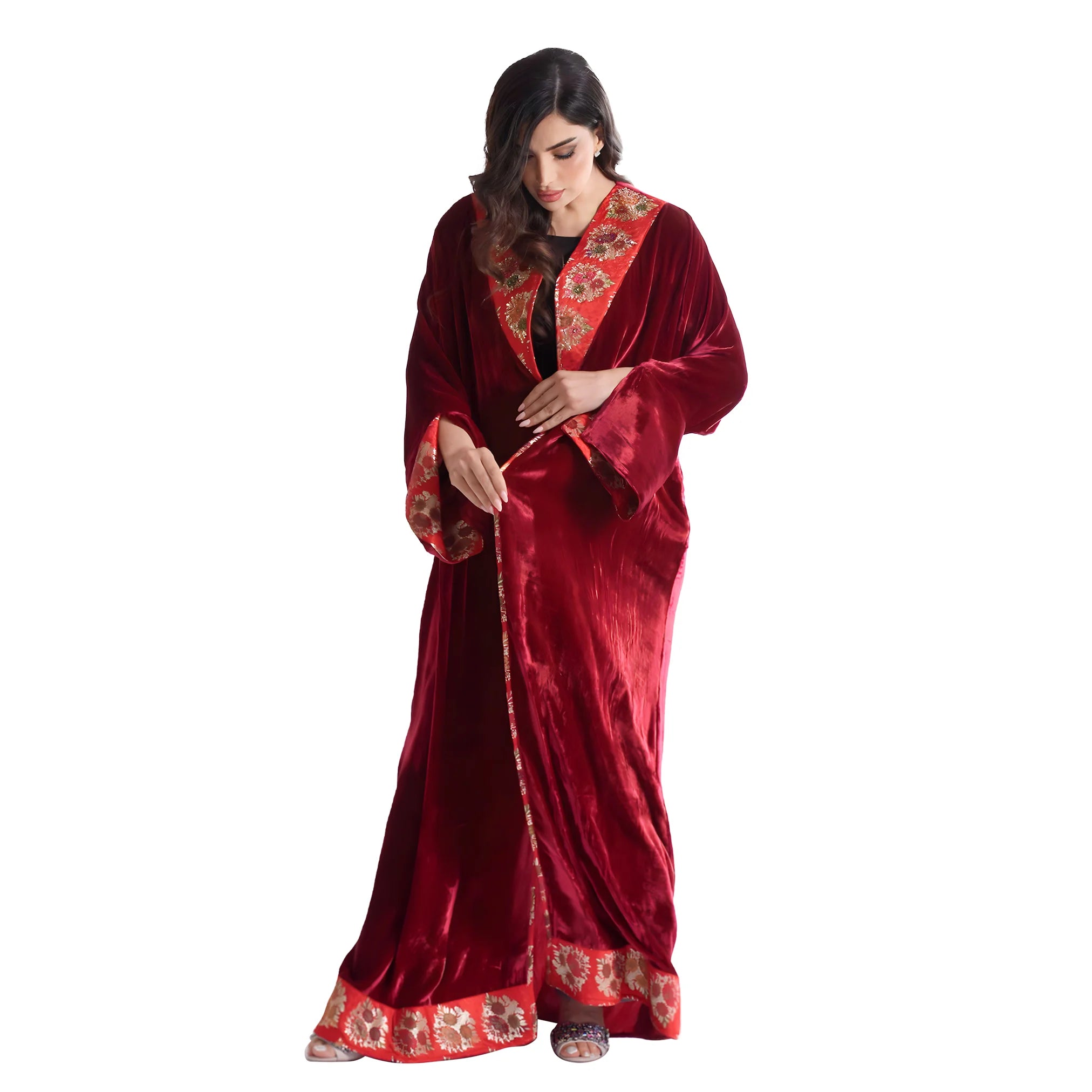 هذه العباية من بازار كوتور صُممت لتُلفت الأنظار دون أن تنطق — مصنوعة من مخمل ناعم فاخر بلون قرمزي عميق، تنساب بخفة لتُعانق الحركة، وتمنح مرتديتها حضورًا مهيبًا ينبض بالهوية.