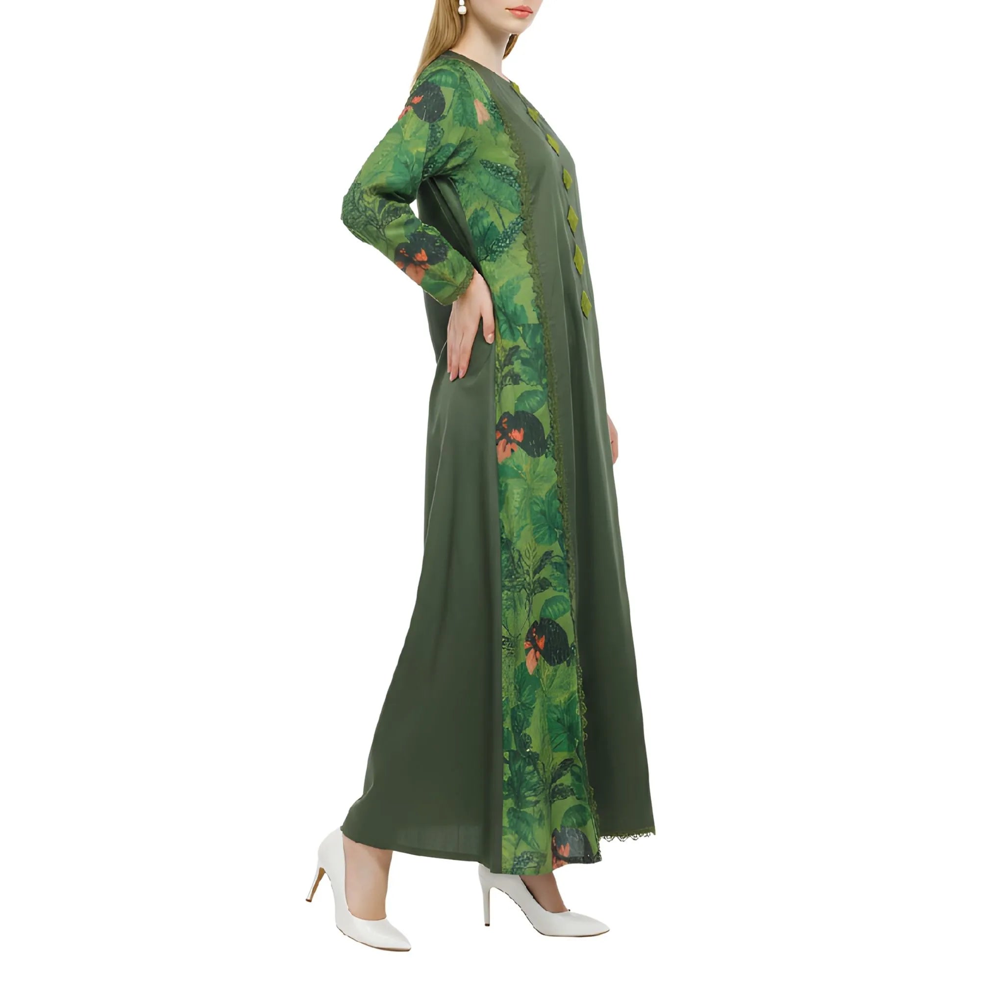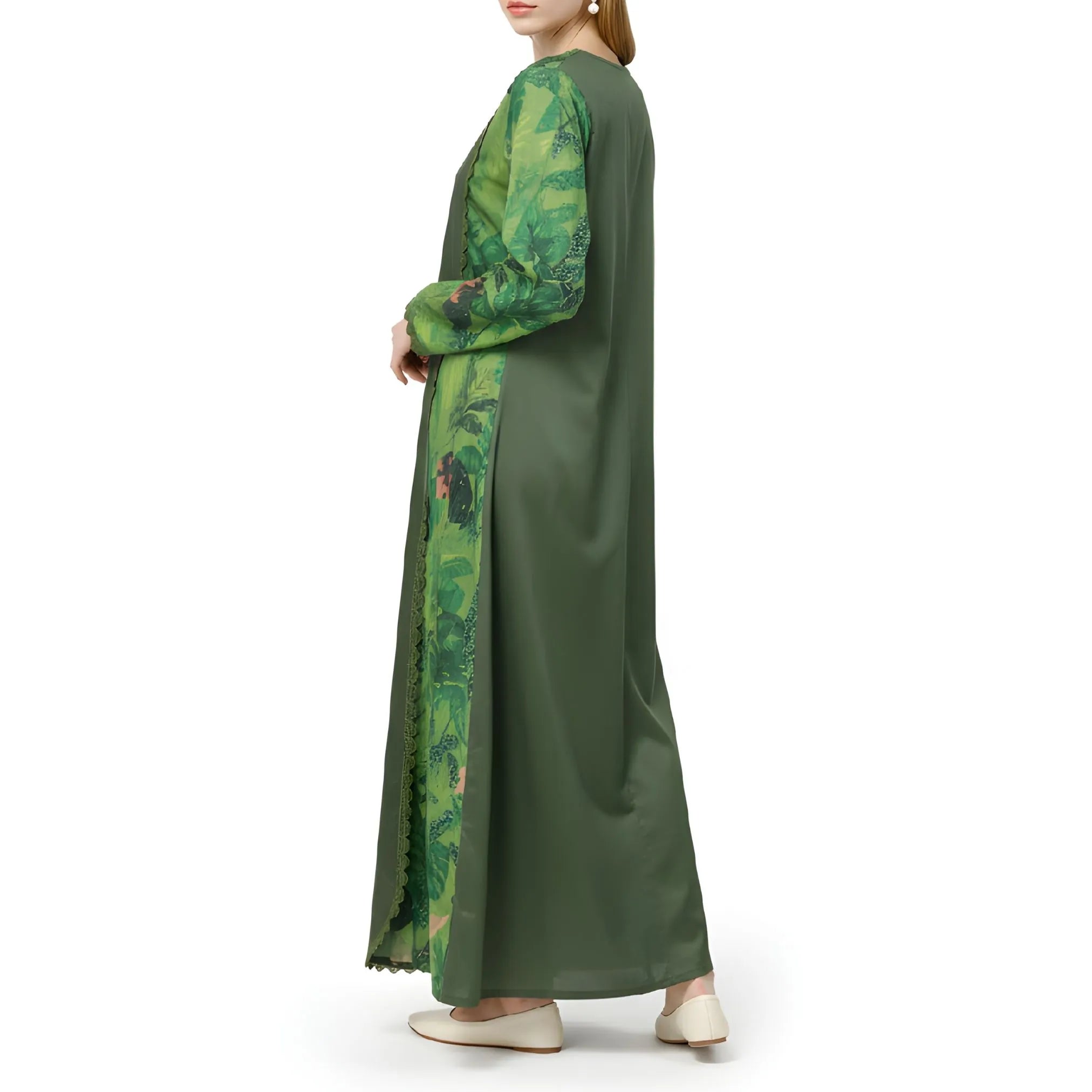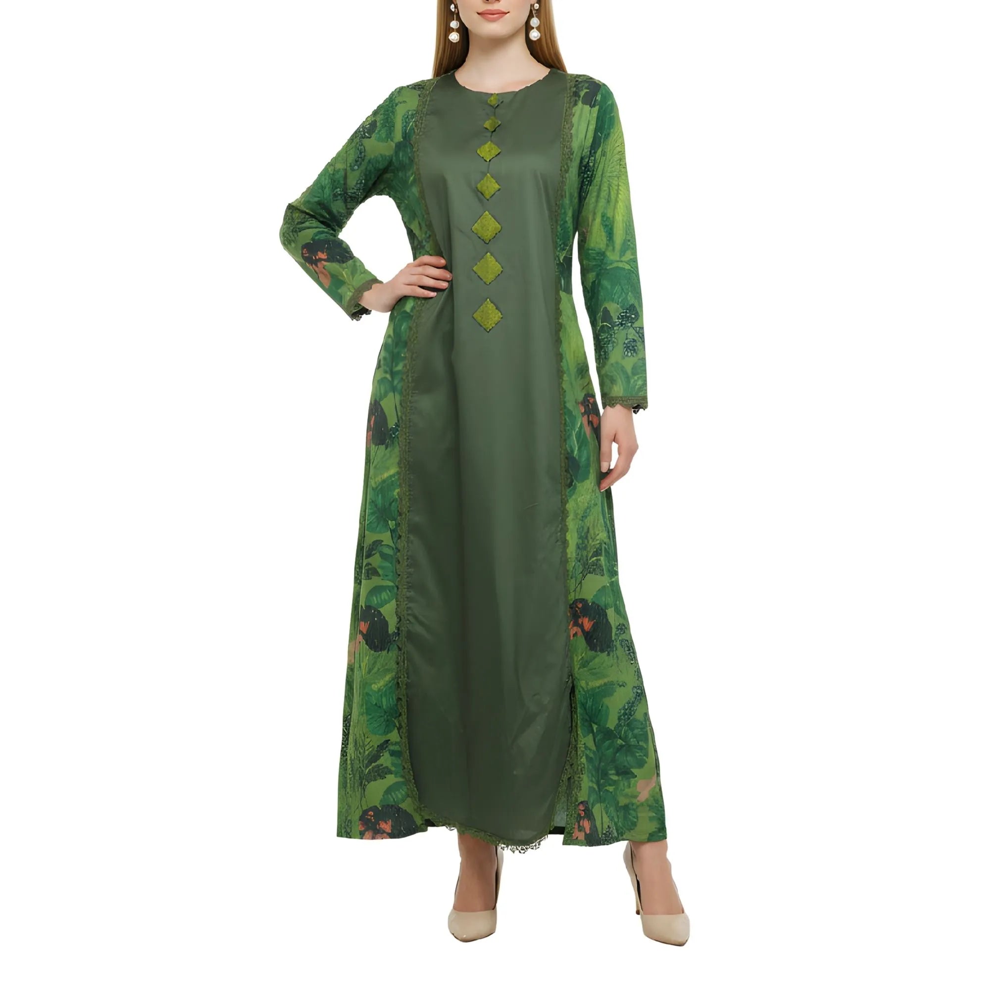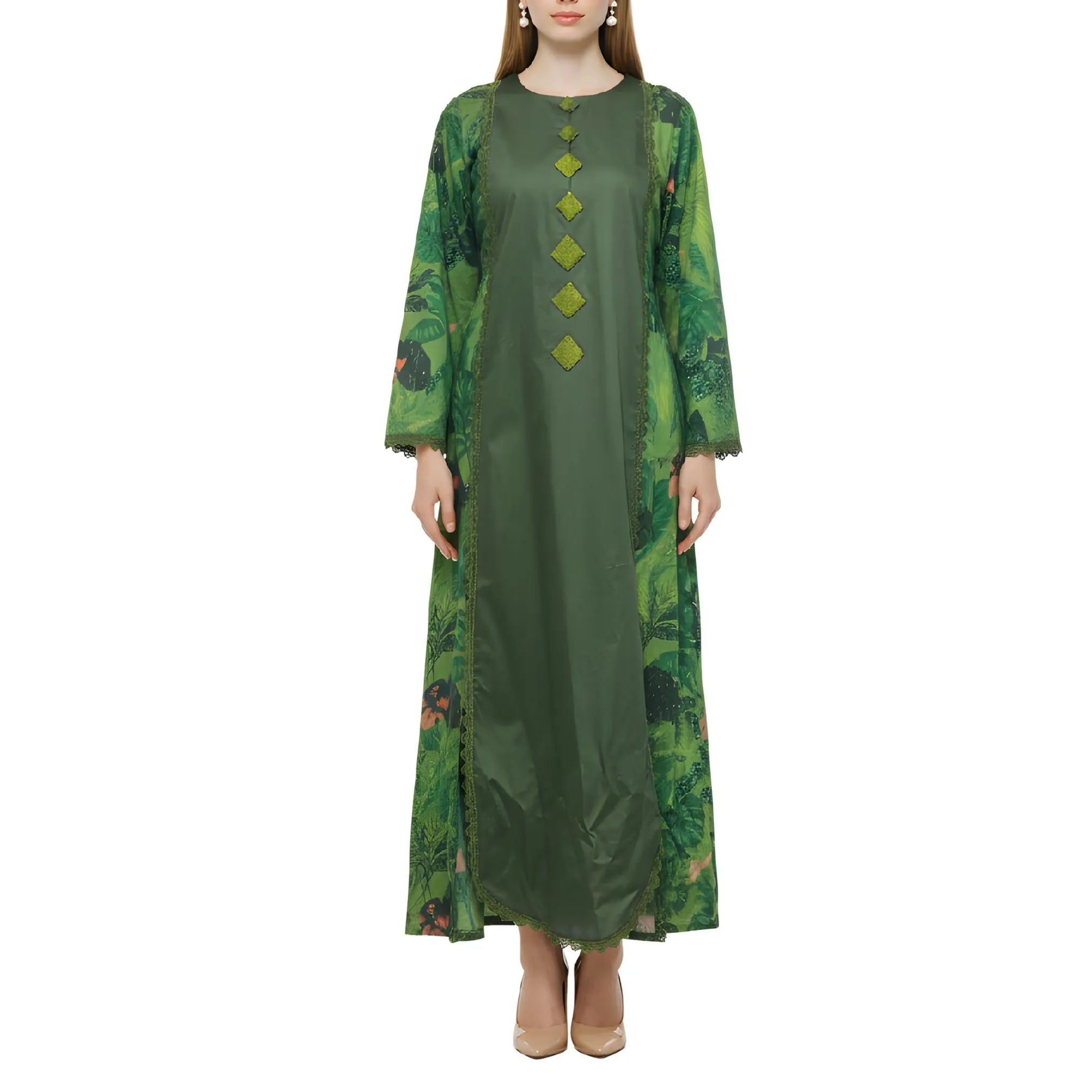 صُمم هذا التصميم من القطن، ويتميز بقاعدة خضراء داكنة تُكملها لوحات مطبوعة مستوحاة من الطبيعة على الأكمام والجوانب، مما يخلق تباينًا رقيقًا وعمقًا بصريًا. تمتد حواف الدانتيل الرقيقة عموديًا على طول الحواف الأمامية، لتُحيط بالتصميم بنعومة وتُضفي لمسة نهائية راقية. تظهر زخارف التطريز اليدوي في منتصف الجزء الأمامي على شكل ماسة أنيقة، مما يُضفي طابعًا حرفيًا دون أن يُطغى على المظهر العام. يتميز خط العنق الدائري ببساطته وهدوئه، مما يسمح للتطريز بالبقاء نقطة التركيز. تُكمل الأكمام الطويلة ذات الاتساع اللطيف والأساور المُزينة بالدانتيل التصميم بتوازن أنيق وذوق رفيع.