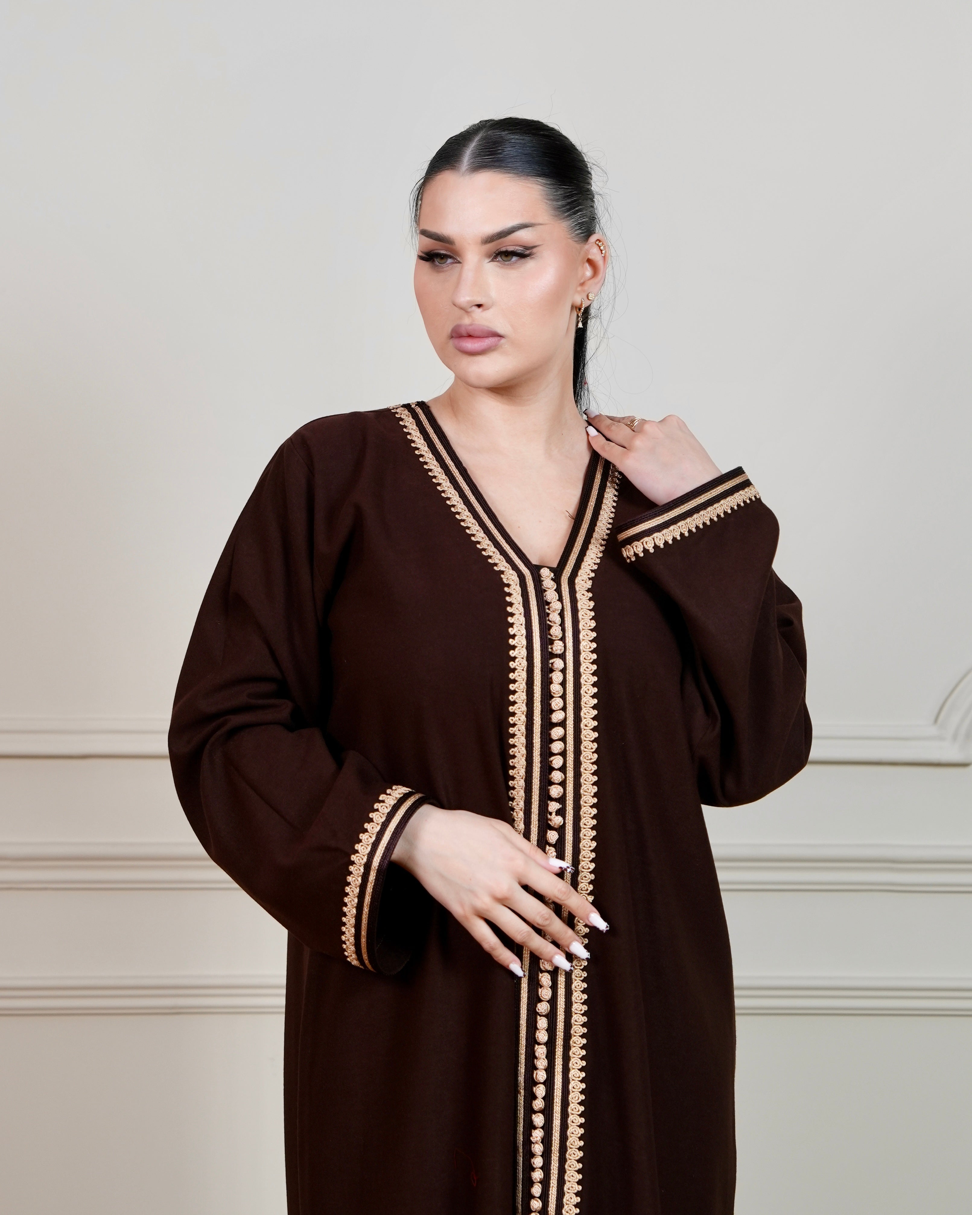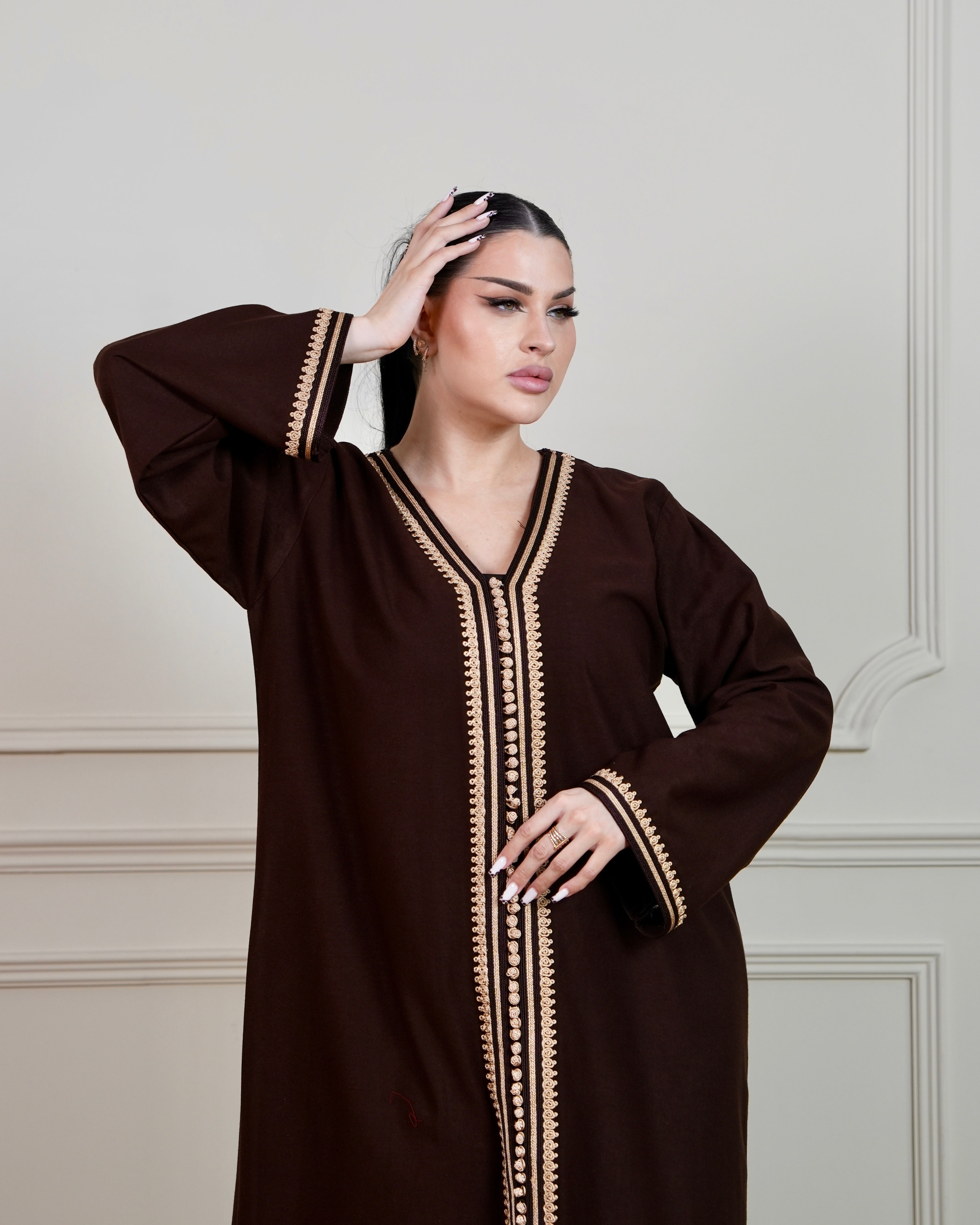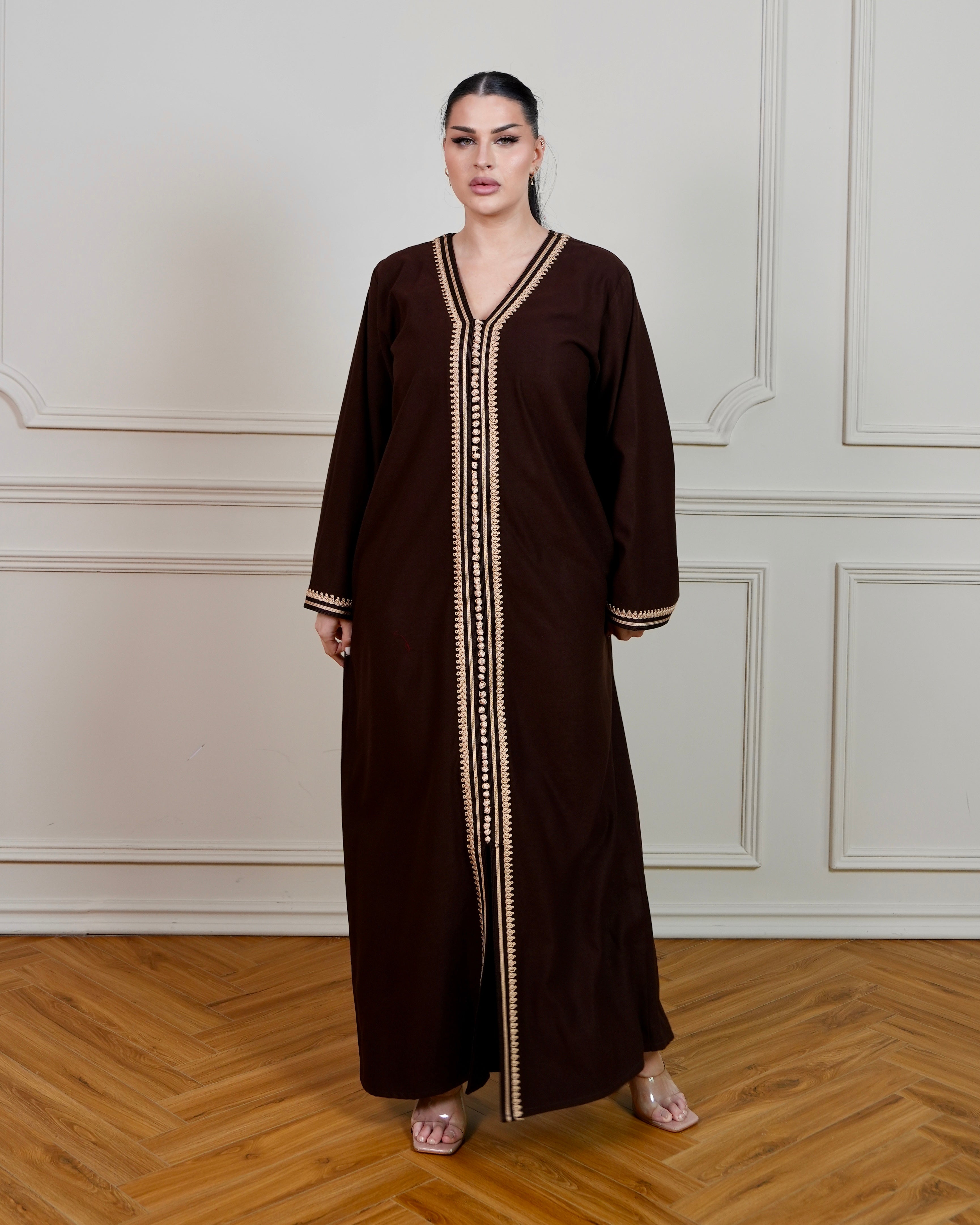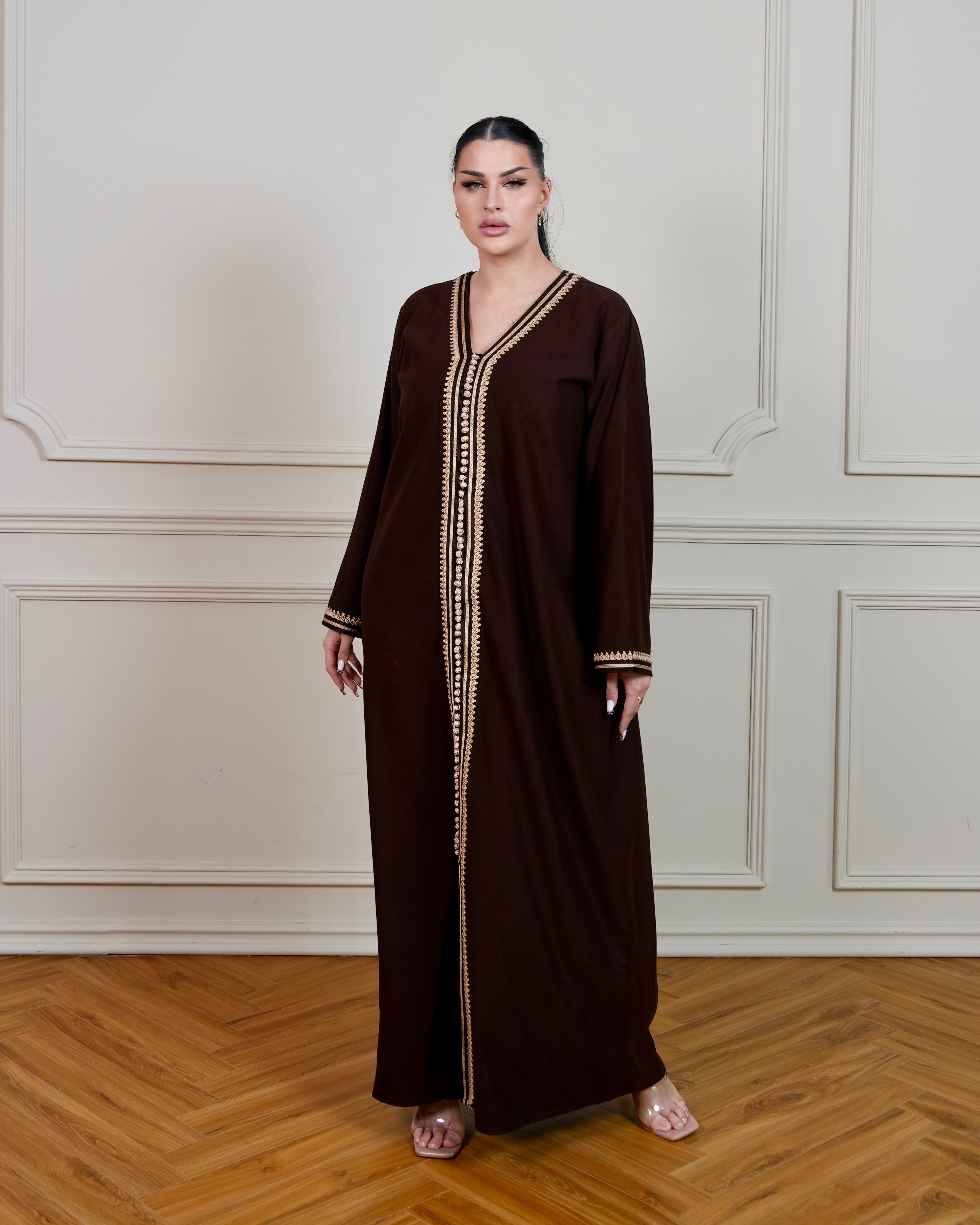 Elegant jalabiya crafted in rich chocolate brown fabric, adorned with intricate beige hand embroidery designs that showcase traditional craftsmanship. The flowing silhouette offers comfort and grace, perfect for special occasions and everyday wear.