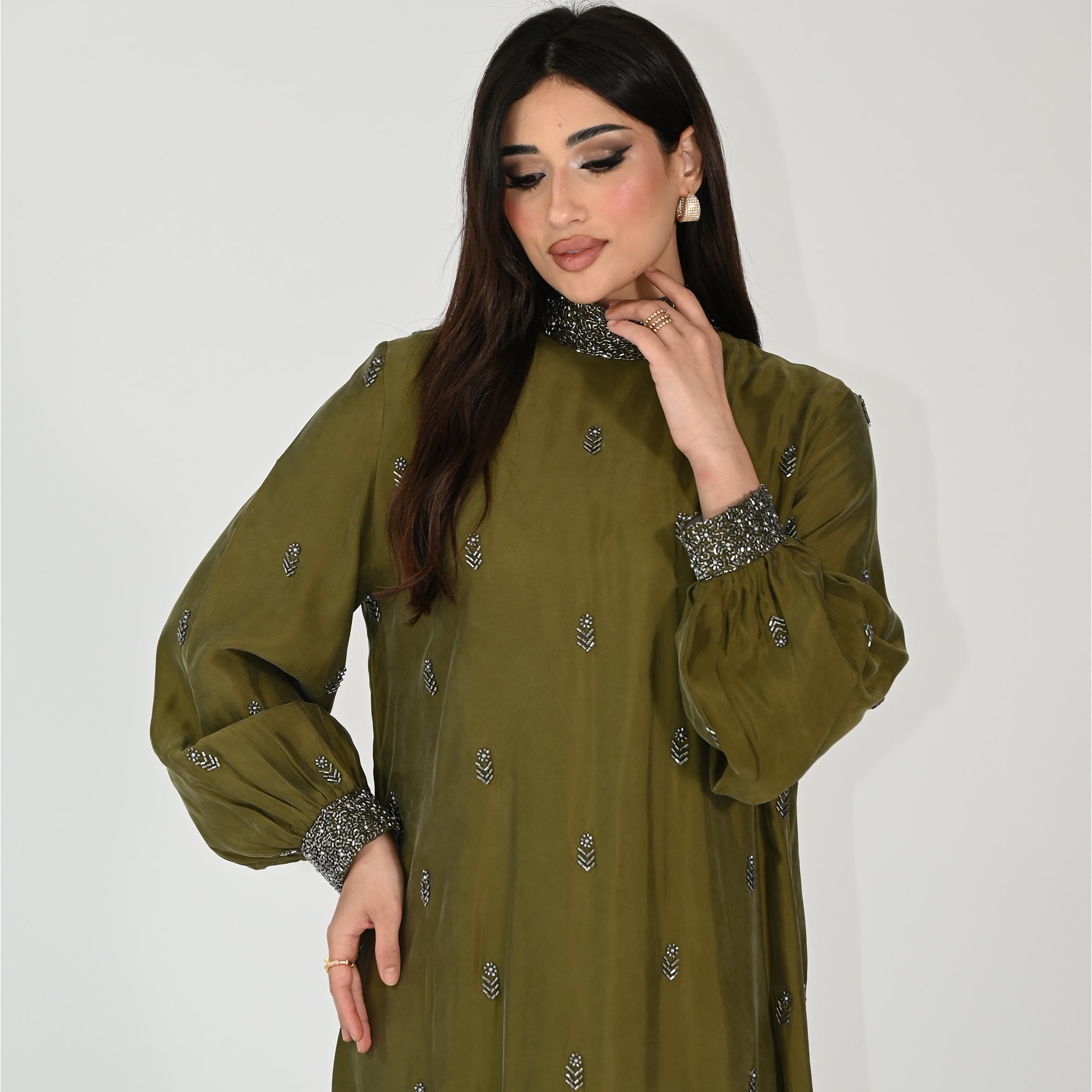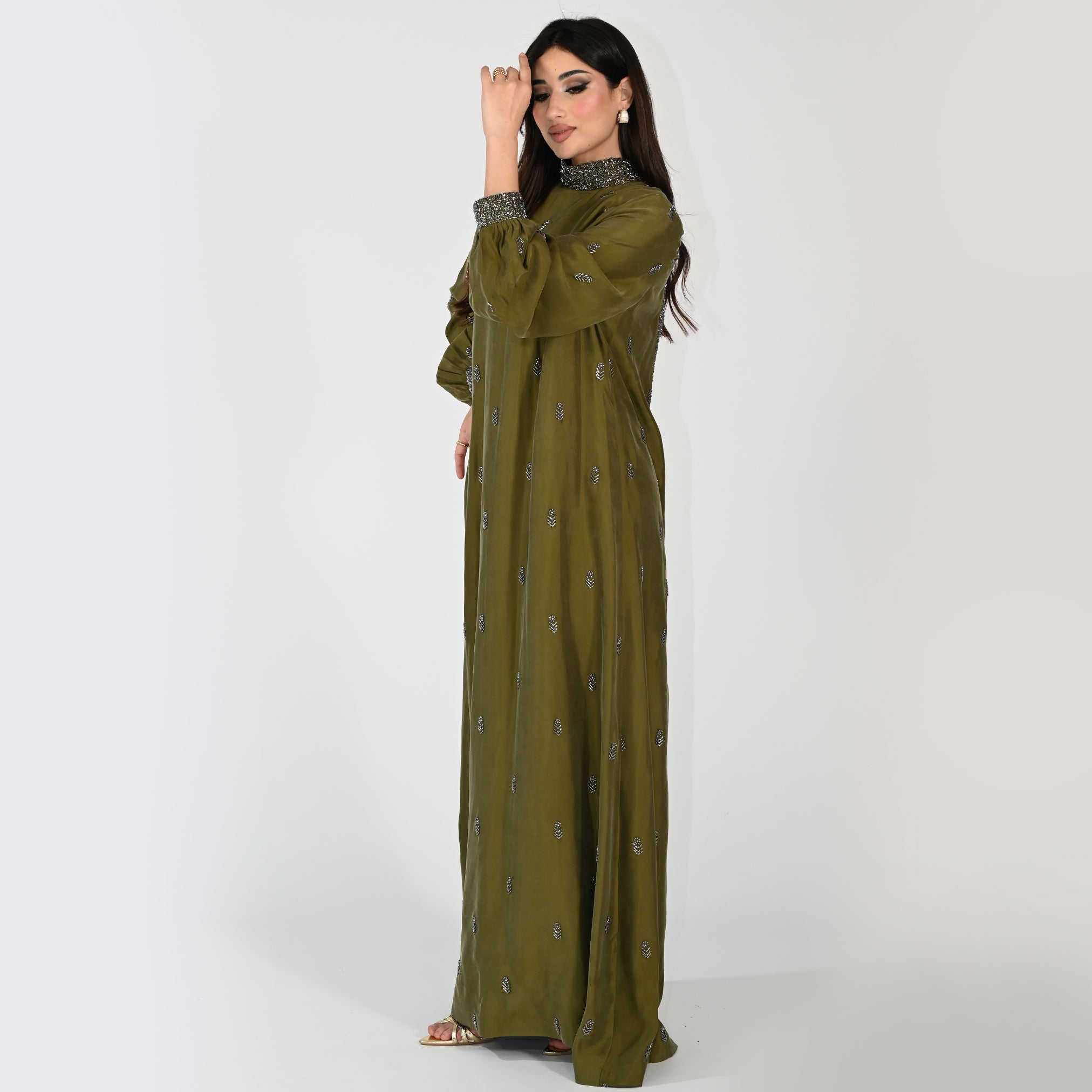 Elevate your wardrobe with this exquisite luxury kaftan, crafted in rich olive green with a sophisticated bare-back silhouette. Intricate embroidery adorns the collar and wrist area, adding refined detail and timeless elegance to every wear. The flowing design offers comfort and grace, perfect for special occasions, evening gatherings, or elevated everyday styling. A statement piece that celebrates craftsmanship and contemporary luxury.