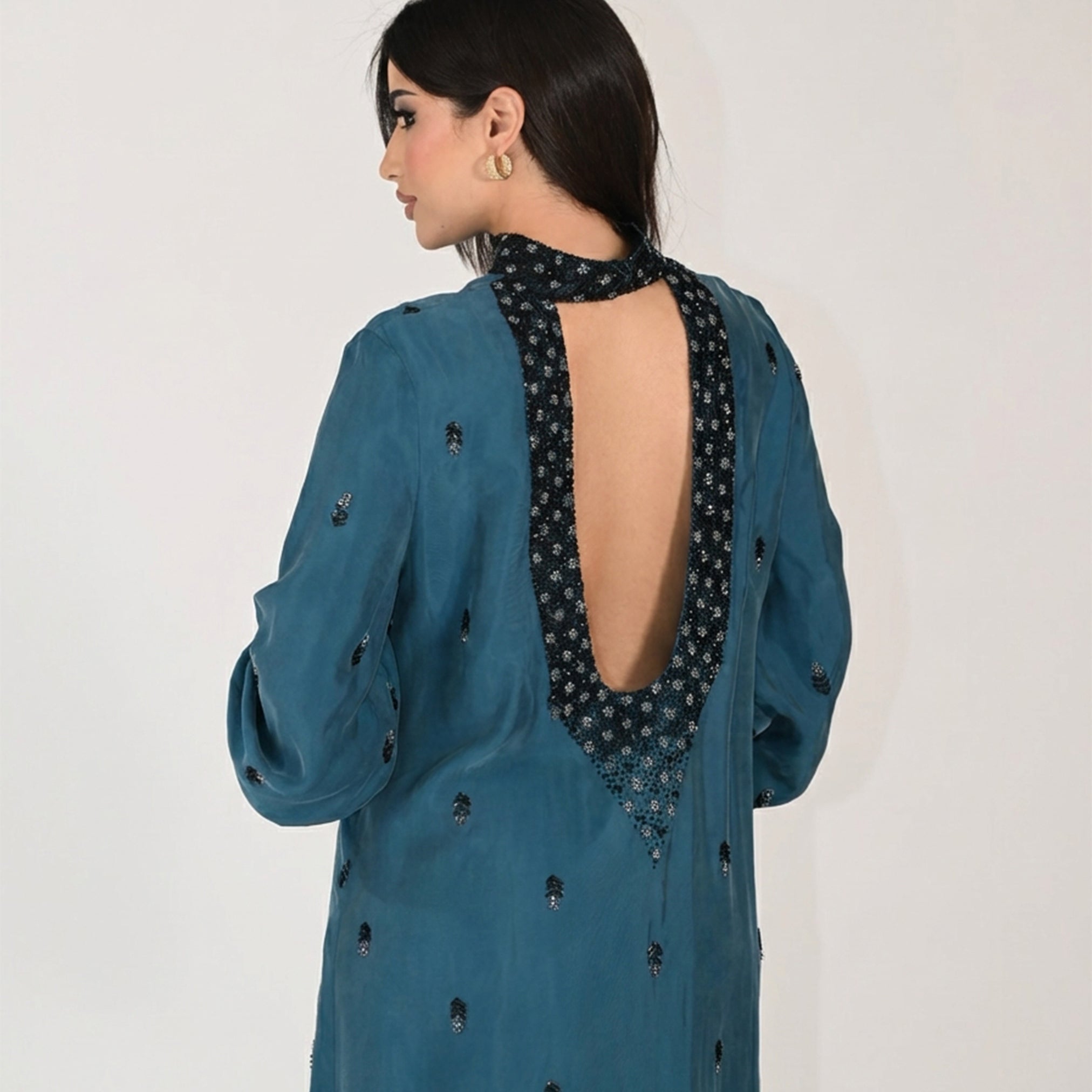 Elevate your wardrobe with this stunning luxury kaftan, crafted in rich teal with exquisite embroidery detailing adorning the collar and wrist area. The bare-back design offers a modern, sophisticated silhouette that flatters while maintaining an air of elegance. Perfect for special occasions, intimate gatherings, or making a bold statement at any event. The intricate embroidery work showcases fine craftsmanship, while the flowing fabric drapes beautifully for all-day comfort. A timeless piece that blends traditional artistry with contemporary style.