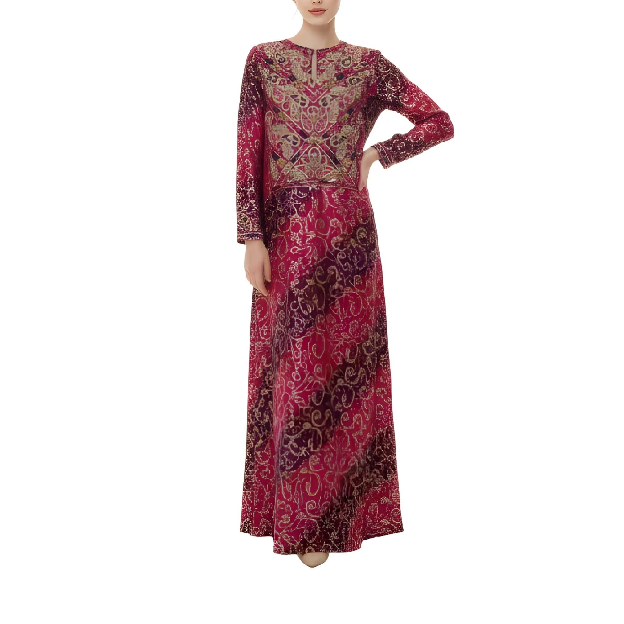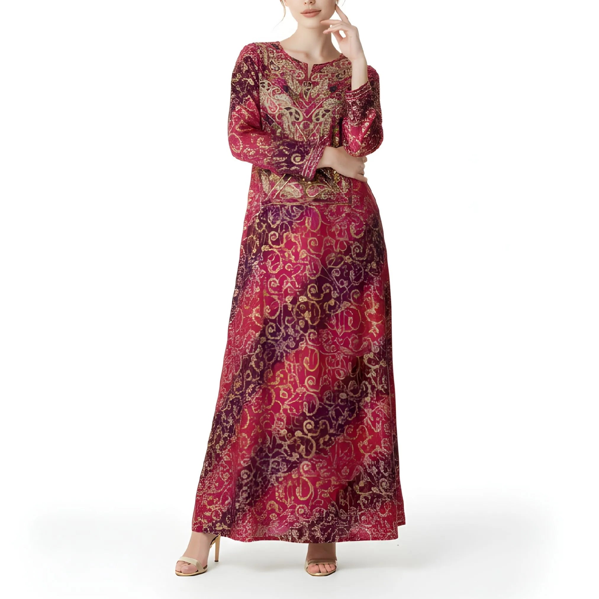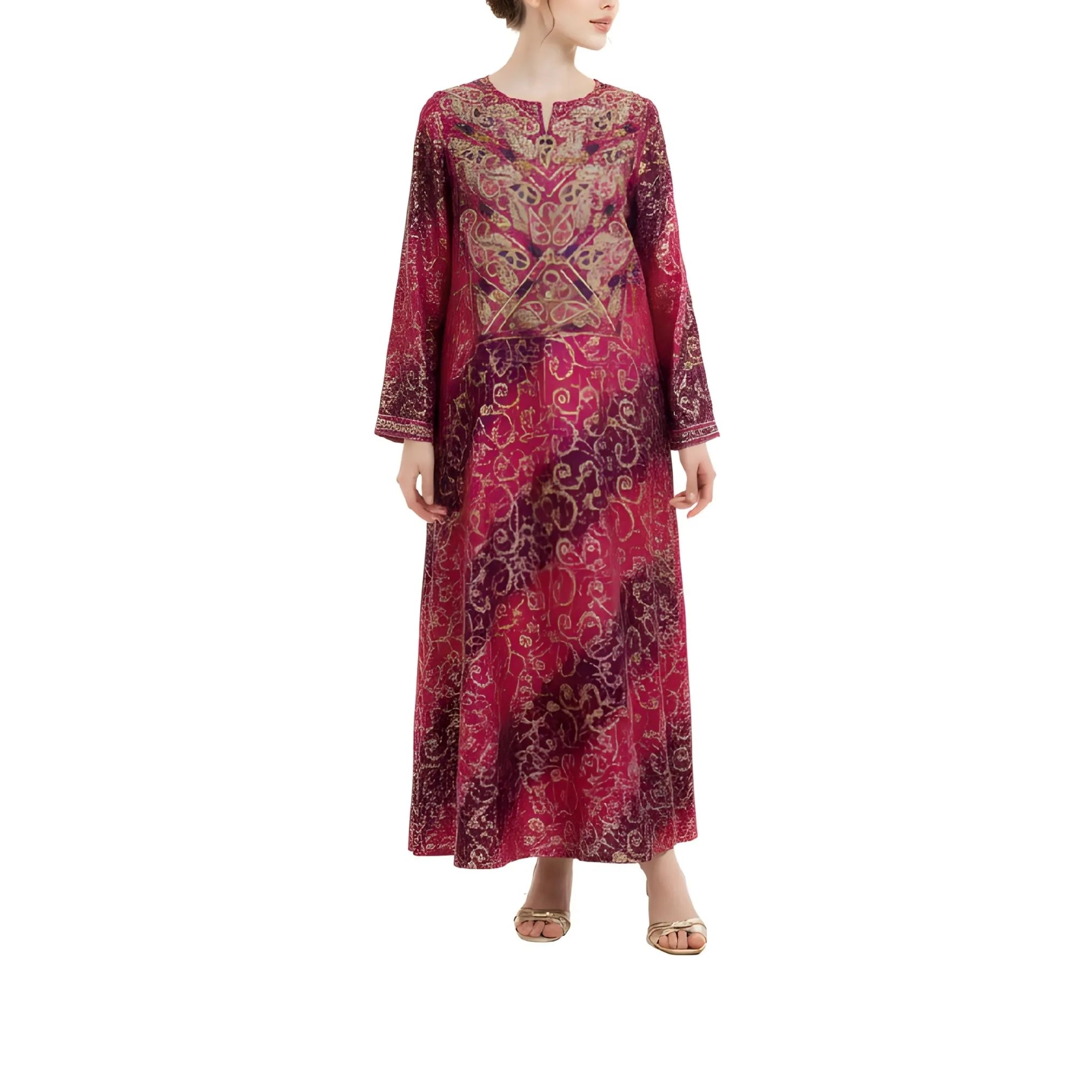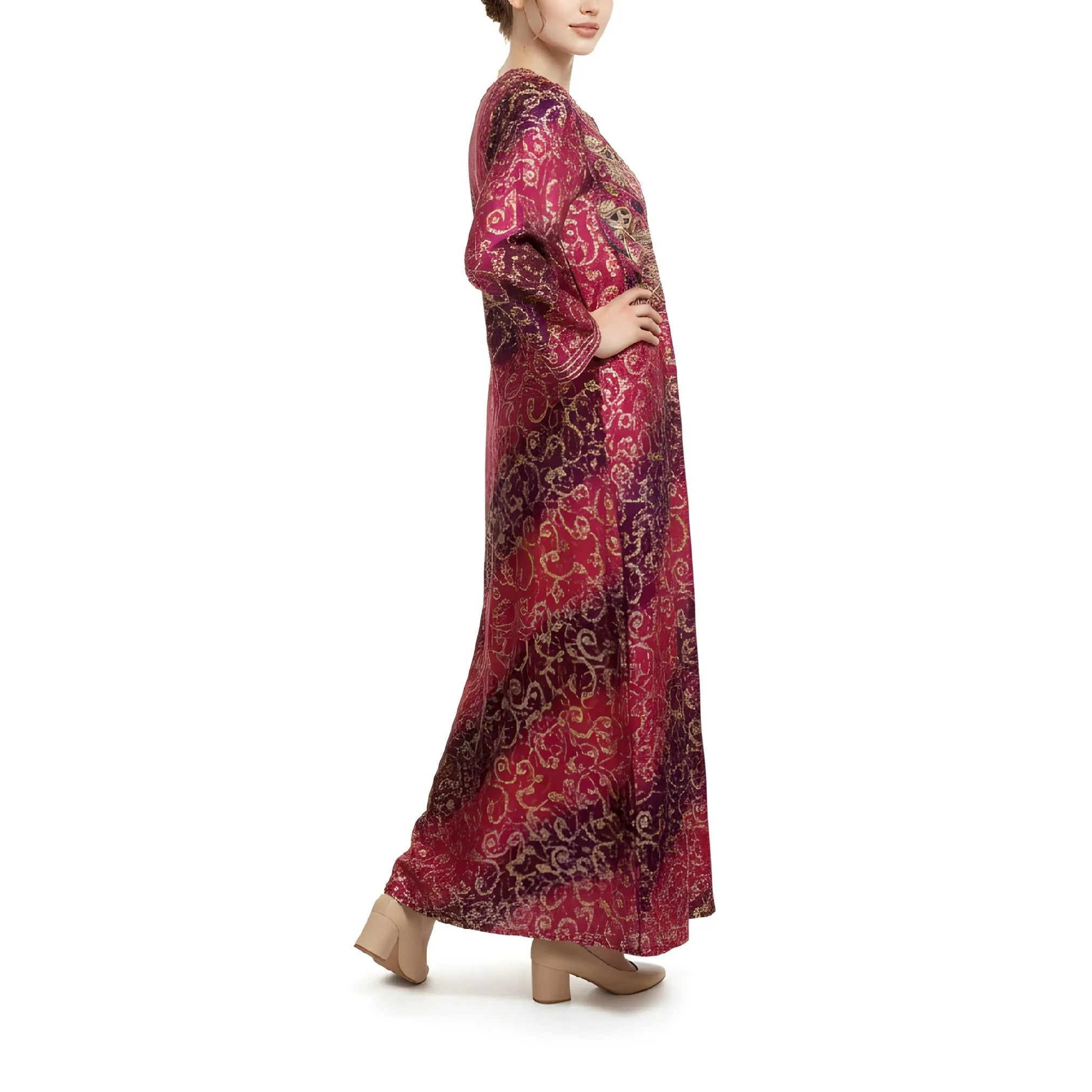 الجلابية مصنوعة من القطن، وتتميز بلون عنابي داكن مهيمن، تتخلله نقوش متعددة الألوان متقنة تضفي عمقًا وثراءً بصريًا. تتوسط صدرية الجلابية تطريزات ذهبية يدوية بارزة، تشكل زخرفة متناسقة تجذب الأنظار مع الحفاظ على رقيها الثقافي. يُزين خط العنق بفتحة بسيطة تُحسّن من سهولة الارتداء دون المساس بالتغطية. أما الأكمام الطويلة، فهي مزينة بنقوش متناسقة وأساور أنيقة، مما يضمن تناسقًا بصريًا في التصميم. يبدو القماش ناعمًا ومساميًا، مما يسمح للتصميم السطحي الدقيق بالبقاء مريحًا حتى مع ارتدائه لفترات طويلة.