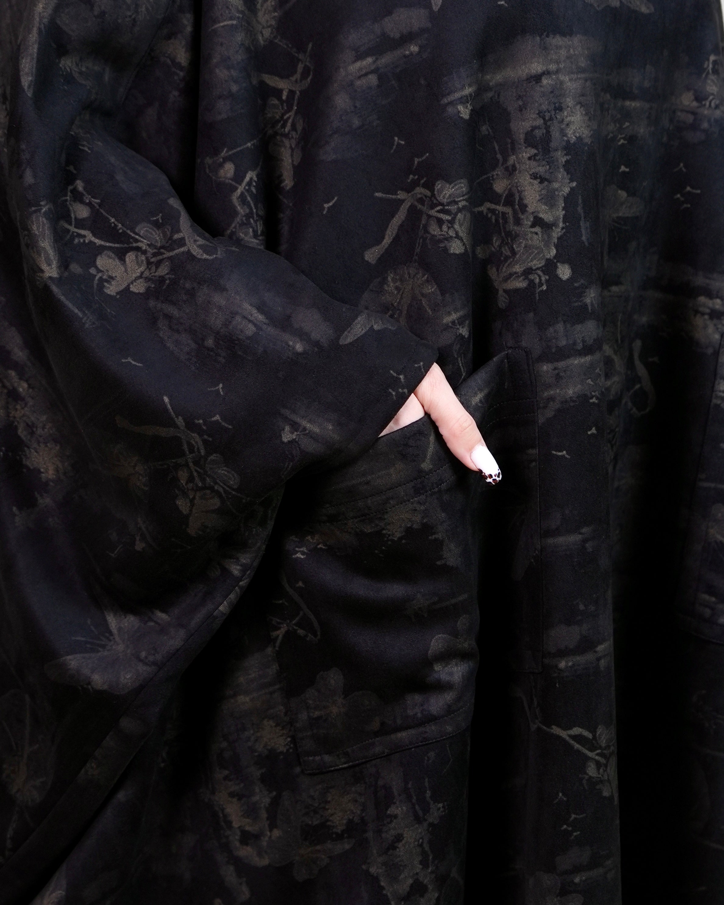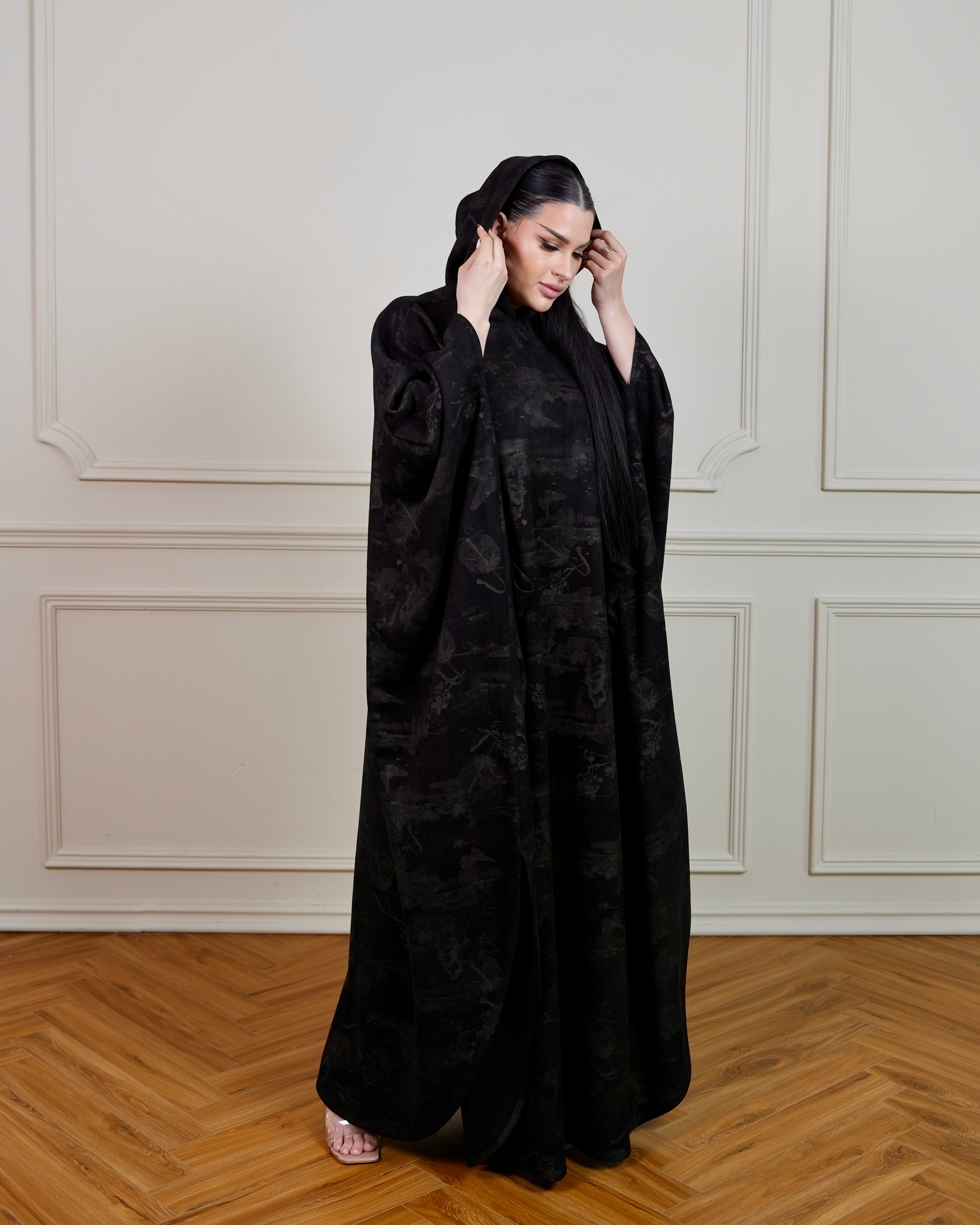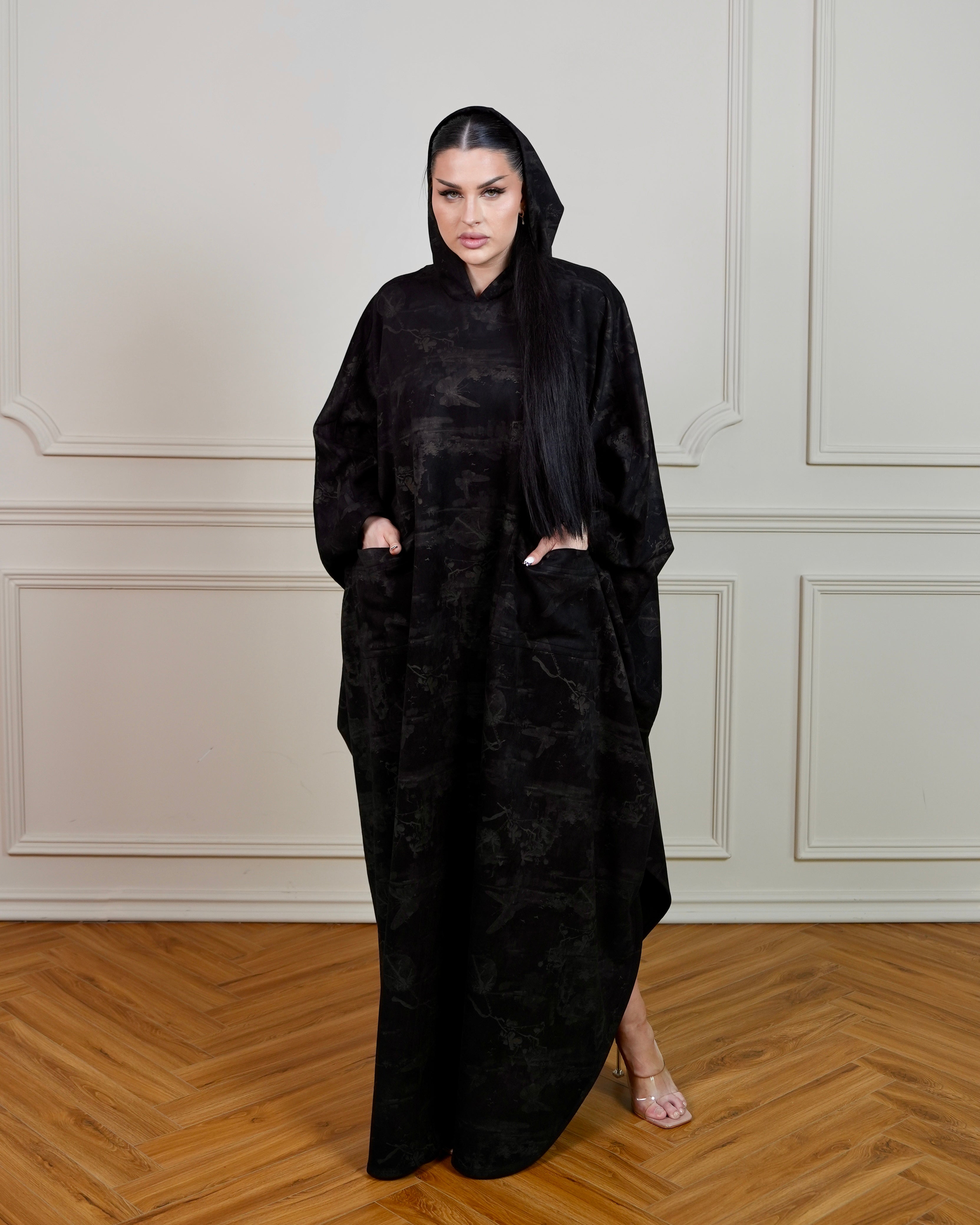 Printed Black Jalabiya with Hoodie and Side Pockets