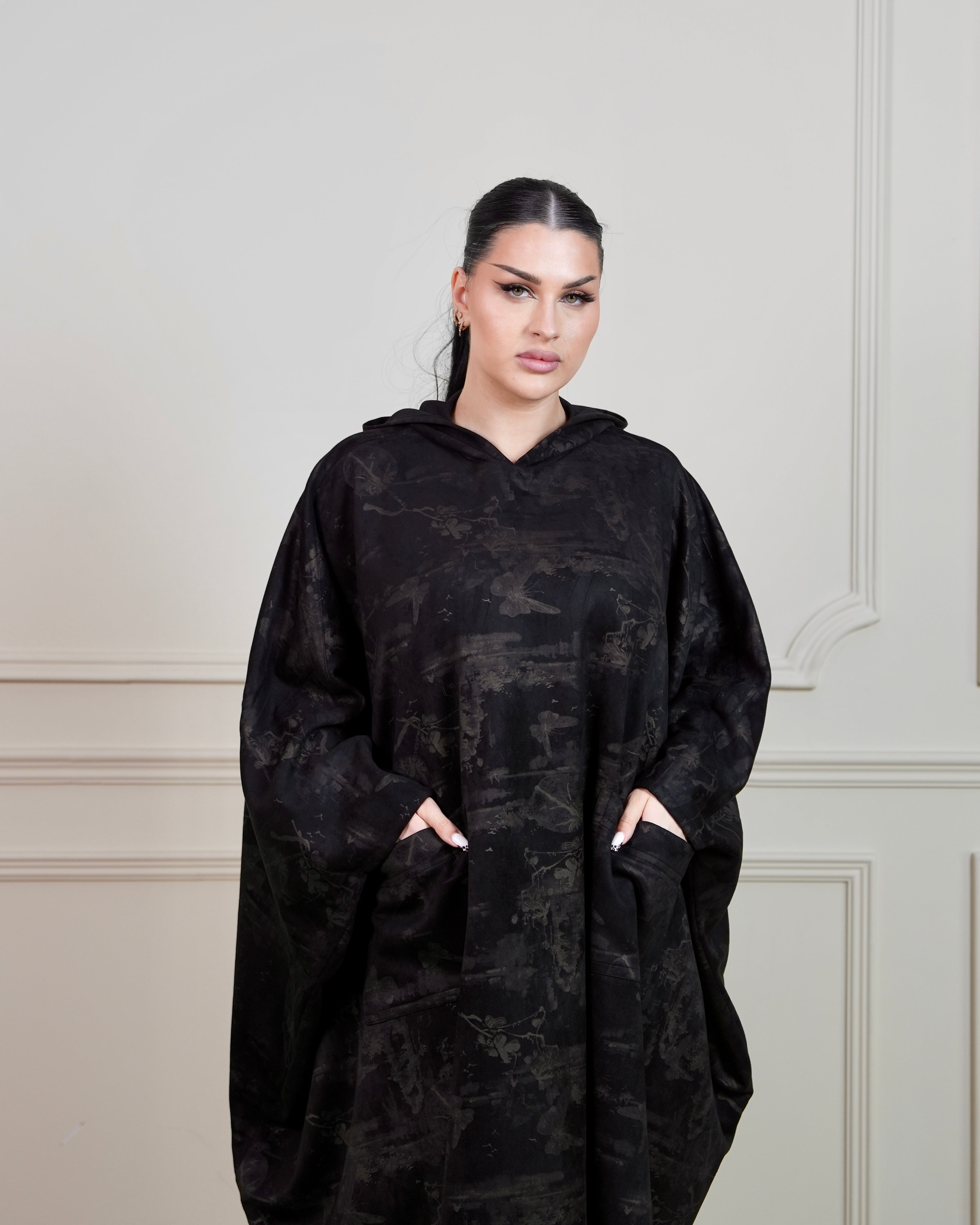 Elevate your everyday style with this contemporary printed black jalabiya, thoughtfully designed for modern comfort and functionality. The integrated hoodie adds a versatile layer perfect for layering or standalone wear, while practical side pockets keep your essentials within reach.