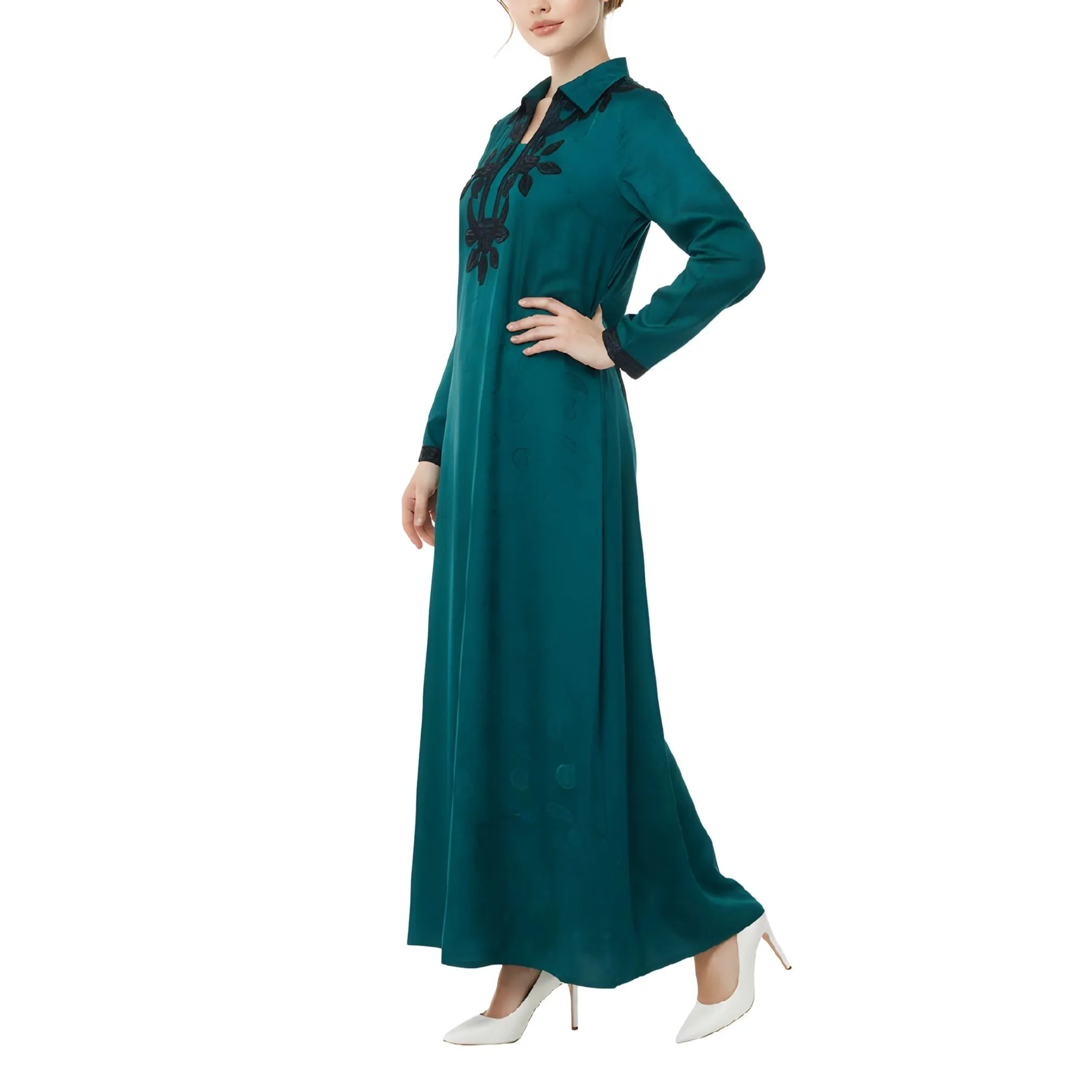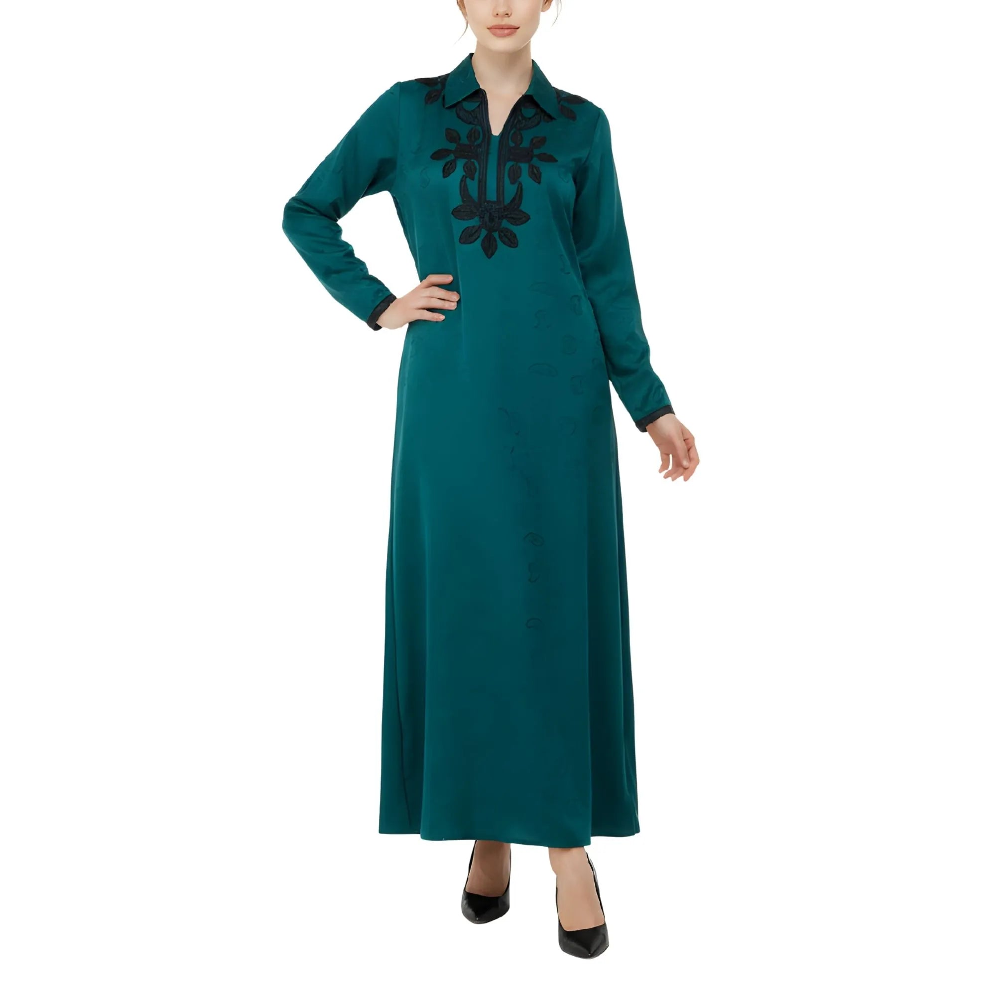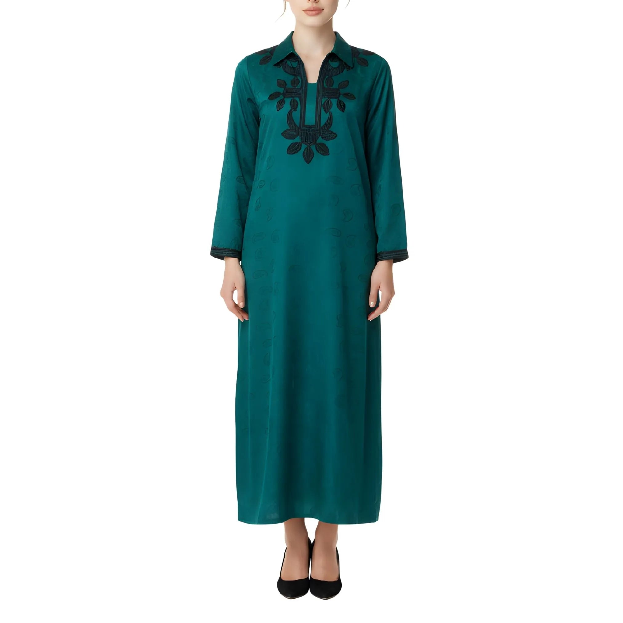 صُمم هذا التصميم من قماش قطني بلون أزرق مخضر داكن، ويتميز بياقة كلاسيكية تضفي لمسة أنيقة مستوحاة من القمصان مع الحفاظ على مظهرها البسيط. تتوزع التطريزات السوداء بشكل بارز على الجزء الأمامي، لتشكل نقشًا متناظرًا يجذب الأنظار عموديًا ويعزز المظهر العام. وتستمر التطريزات السوداء المتناسقة على الأكمام، مما يخلق تناسقًا بصريًا وجمالًا متناغمًا. يبدو القماش ناعمًا وخفيف الوزن بلمسة نهائية غير لامعة، مما يسمح للتطريز بالبروز دون أن يطغى على التصميم. وتنتهي الأكمام الطويلة بأساور أنيقة، مما يعزز المظهر المصمم بدقة مع الحفاظ على الراحة للارتداء اليومي.
